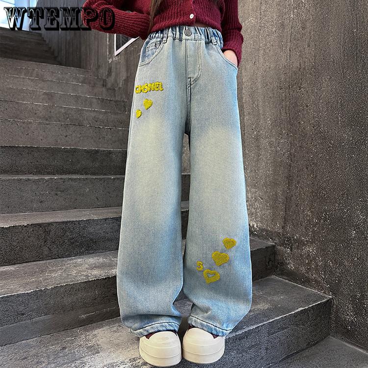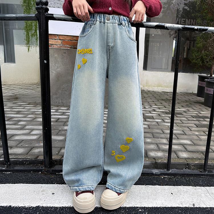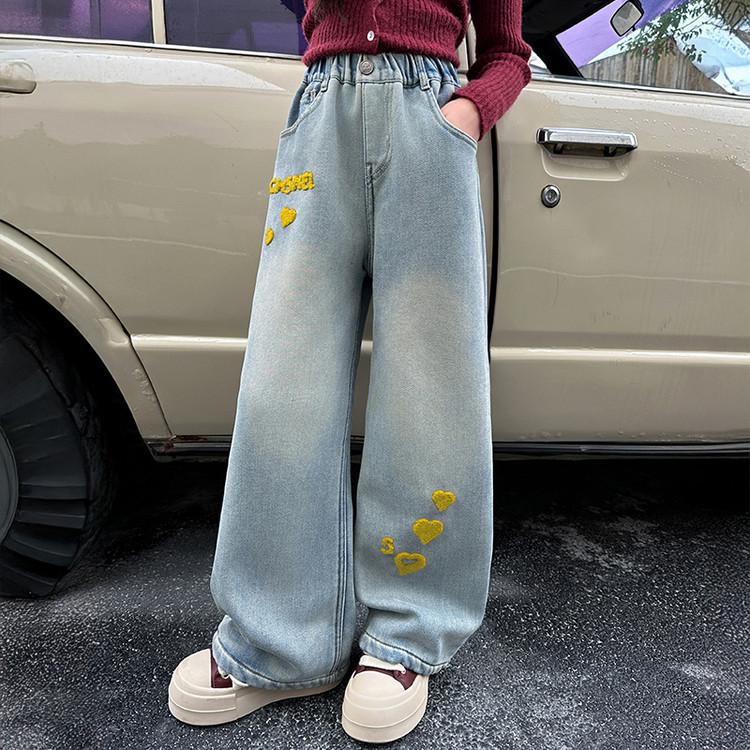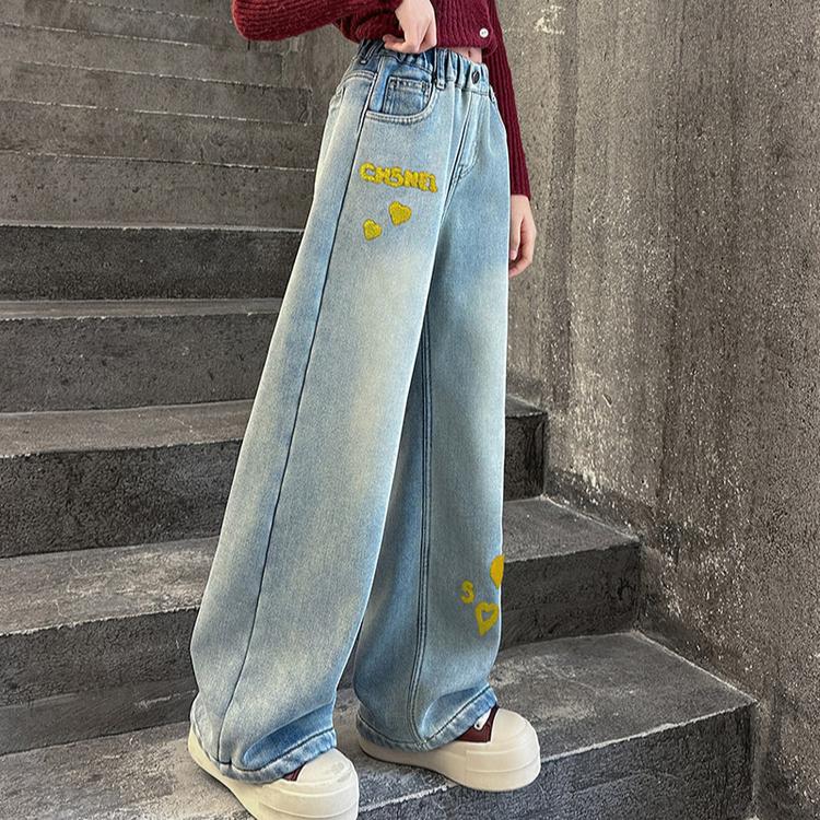 Джинсы для девочек Весна и Осень Детские Вышивка Сердце Широкие Брюки Прямые Брюки Модные Брюки с вышивкой