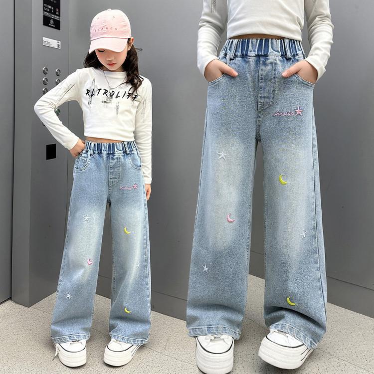 Девочки Прямые Брюки Весенне-Осенние Стили Джинсовые Светлые Вышитые Эластичные Брюки с Широкими Штанинами Детские Джинсы