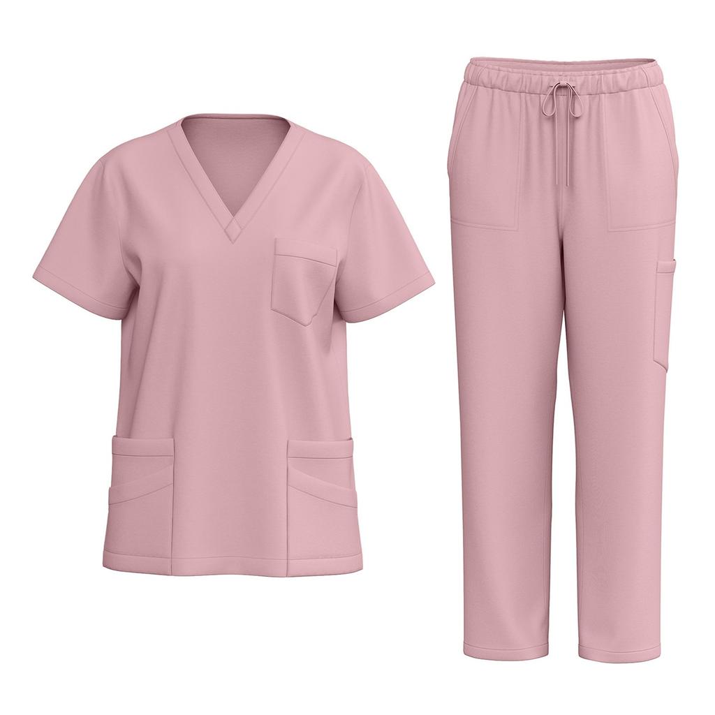 Женская униформа из быстросохнущих тканей с V-образным вырезом и карманами, с короткими рукавами и длинными брюками, однотонный рабочий костюм