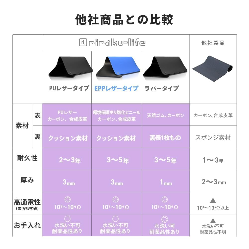 [Size] 34cm x 25cm [Thickness] 3mm [Material] Surface: Black/Conductive leather Back side: Blue/Cushion material [Matte surface resistivity] 10^3 to 10^4Ω [Supported years] 3 to 5 years [Accessories] ●Coil cord (with built-in 100kΩ resistor) Black ●3-prong ground cord 10cm ●Screw type ground connection cord 50cm *If the cord is not long enough, please use the special extension cord sold separately. *If you are using two or more earthing goods and only one earth can be connected, please purchase a splitter (earth branch part) sold separately.