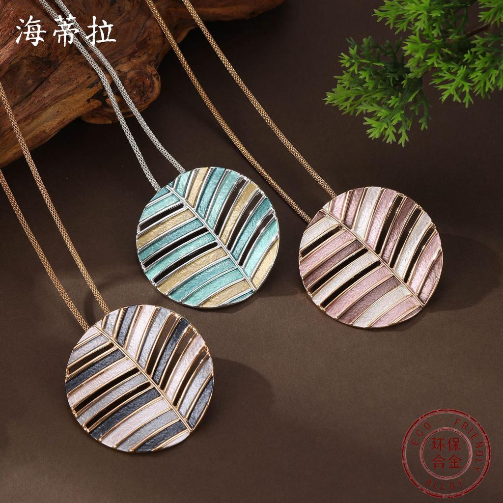Новый эмалевый цвет полый круглый геометрический лист длинная подвеска женская личность круглый лист длинное ожерелье