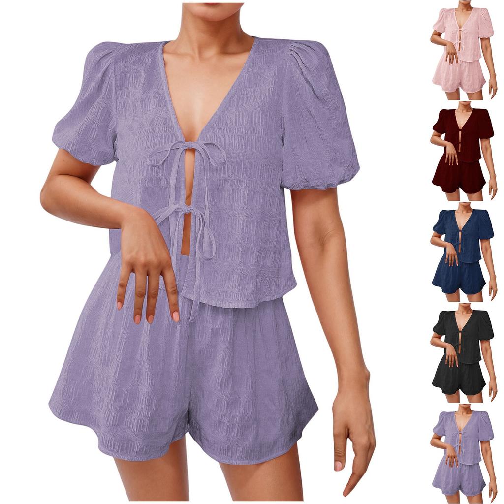 Женские наряды Топ с V-образным вырезом и шорты с высокой посадкой Летний отпускной комплект Повседневный