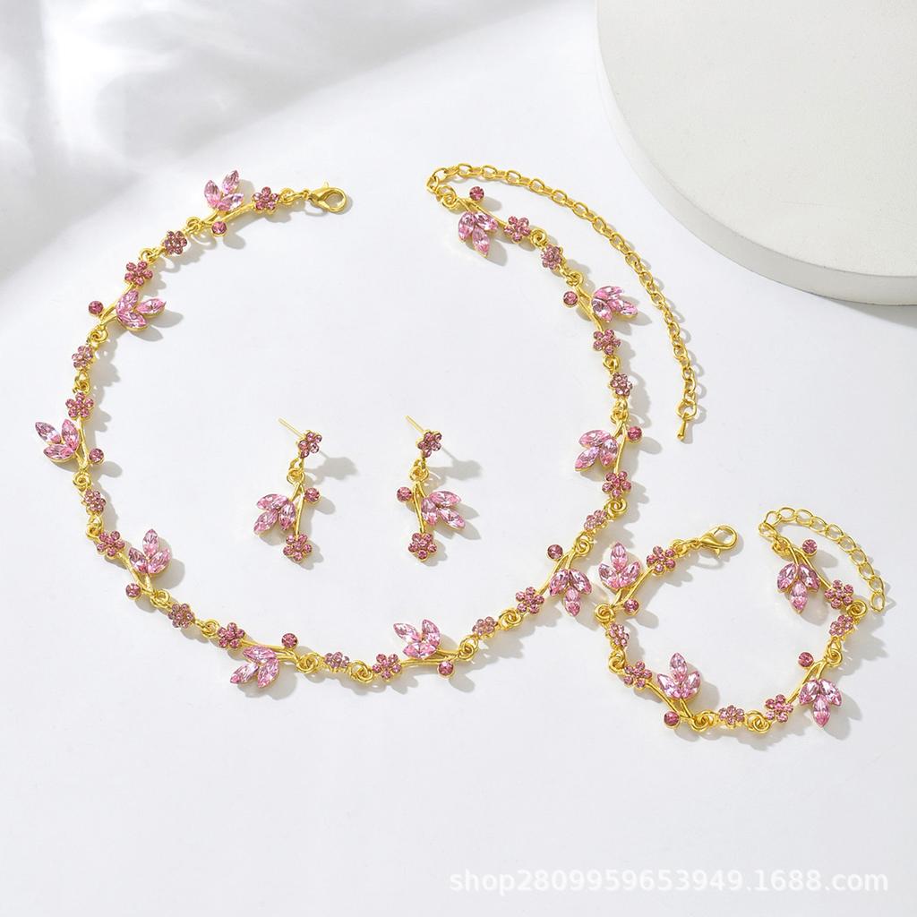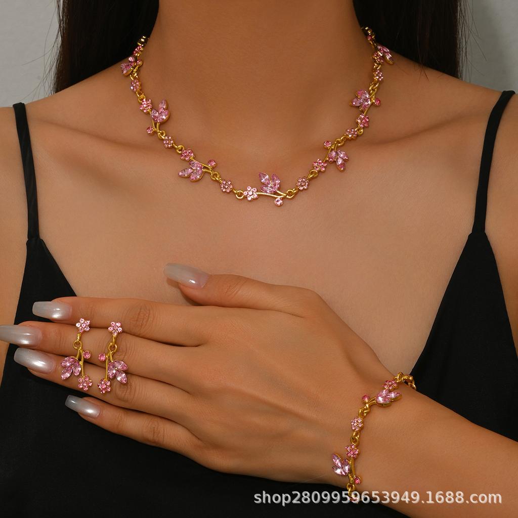 Ожерелье-цветок, серьги, браслет, инкрустированные бриллиантами, женский нишевый дизайн, ins-ветер, розовый комплект.