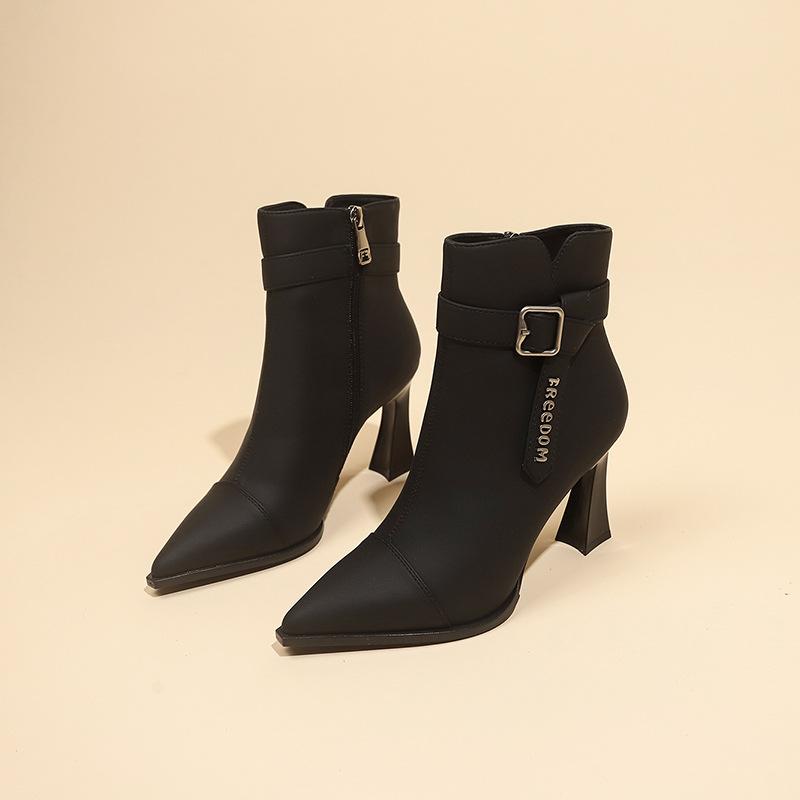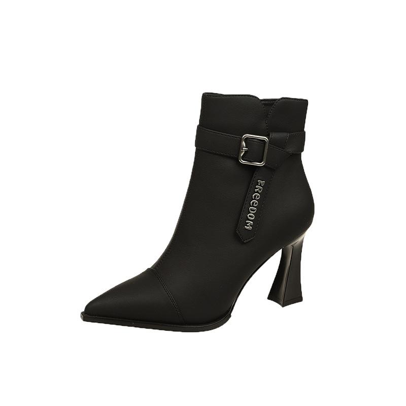 Остроносые короткие ботинки женские осенне-зимние с ремешком и пряжкой, бархатные, на среднем каблуке, модные ботинки, не надоедают ботинки на высоком каблуке