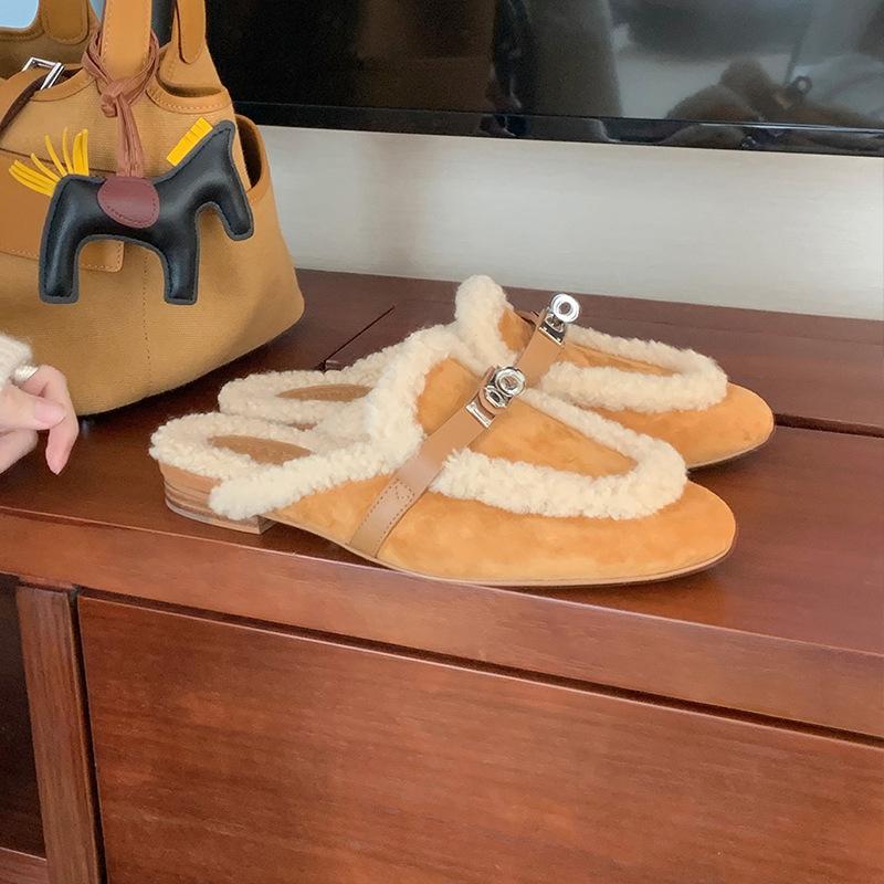 Замок сумка голова овечья шерсть тапочки женские осень и зима толстый каблук один педаль ленивые полусабо для улицы