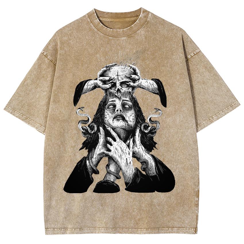 Жуткий персонаж принт змеи хлопок женская выстиранная футболка оверсайз свободная с полурукавом хайстрит панк ретро топ