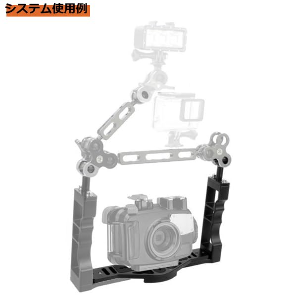 This is a grip tray that can be attached to the bottom of a camera or housing case to serve as a base for adding strobes, lights, etc. By holding the grip, you can take pictures stably.