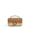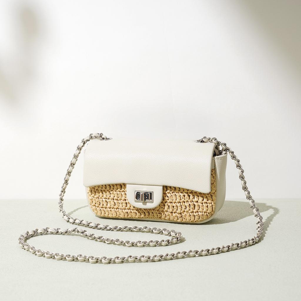 Эта сумка имеет шикарный двухцветный дизайн, сочетающий солому PP и коровью кожу.. Он имеет текстурированную соломенную нижнюю часть, гладкую кожаную верхнюю часть, металлическую застежку-замок и регулируемый плечевой ремень в виде цепочки.. Уникальное сочетание материалов придает ему стильный, летний вид.