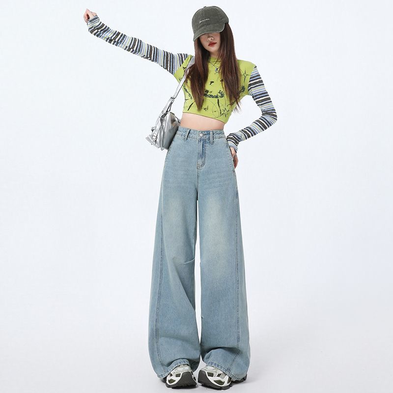 Прямые американские джинсы для женщин, весенняя новинка, с высокой талией, облегающие и плиссированные, свободные широкие брюки в пол