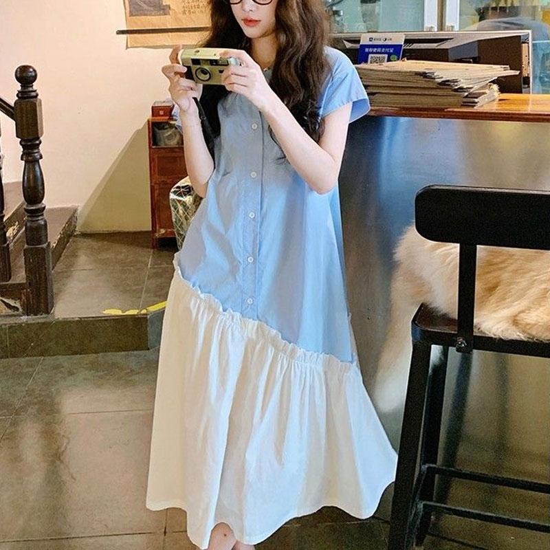 Повседневное корейское платье с коротким рукавом и длинное летнее базовое лоскутное женское модное асимметричное свободное платье с круглым вырезом на пуговицах