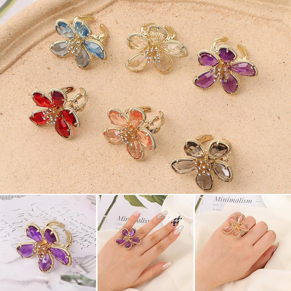 Girl Luxury Exaggerated Shine Rhinestone Flower Big Flower Crystal Ring Open Adjustable Fairy Ring