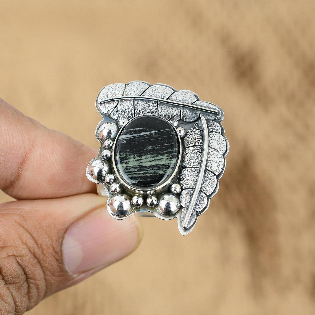 Овальное кольцо для помолвки с натуральным яшмой «серебряный лист», ручной работы из серебра 925 пробы