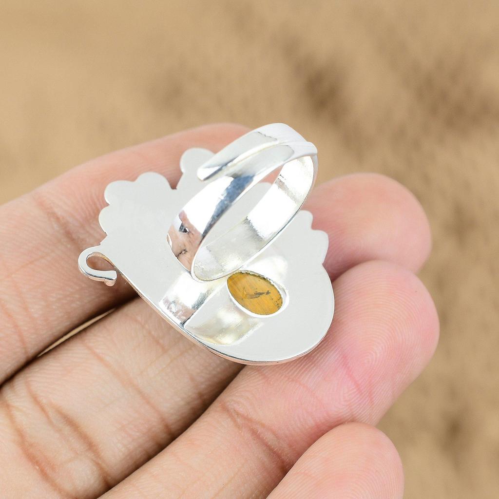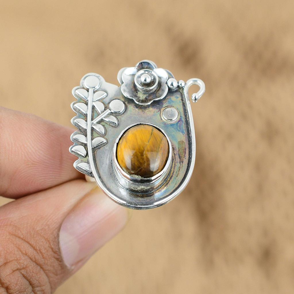 925 Sterling Silver Oval Tiger's Eye Stone Statement Flower Promise Ring Jewelry