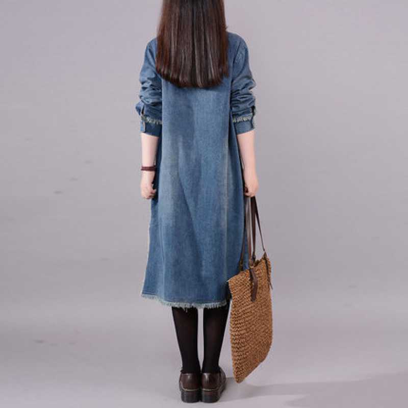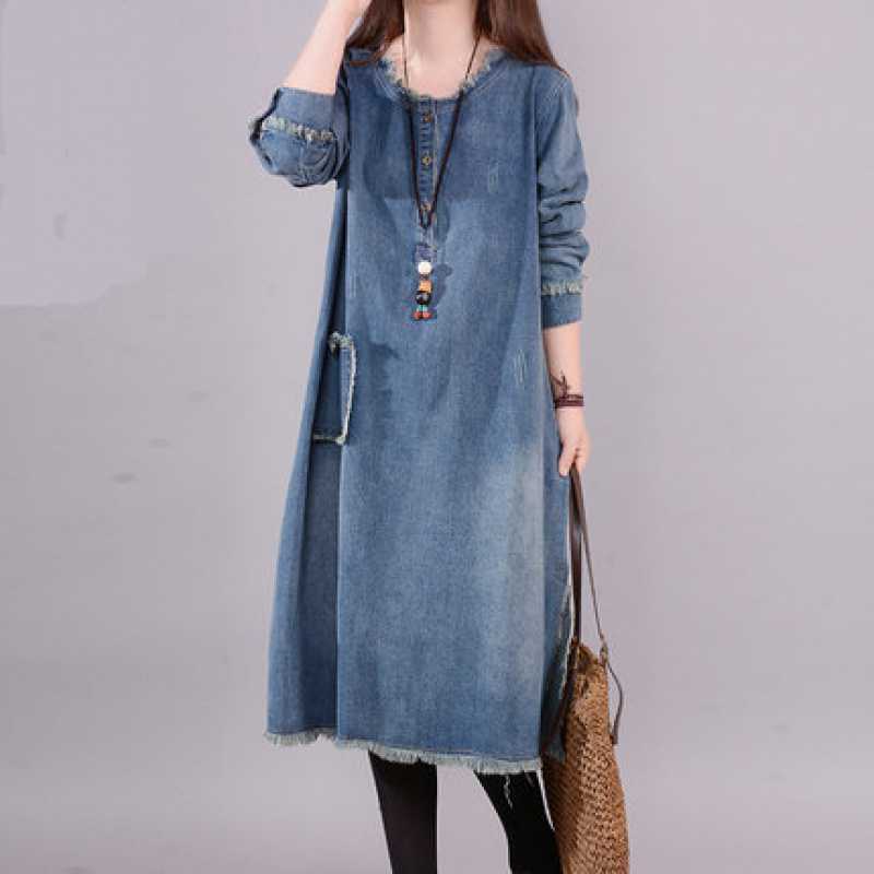 Модное женское платье из денима свободного кроя с плюшевой отделкой по краю и карманами, трендовое осеннее платье с круглым вырезом и длинными рукавами