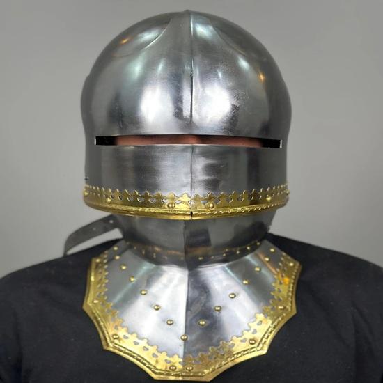 Этот тщательно изготовленный средневековый немецкий готический шлем-салад изготовлен из прочной стали 18-го калибра и украшен великолепными латунными украшениями.. Этот шлем, закрывающий всю голову, вдохновленный эпохой позднего Средневековья, обеспечивает как аутентичность, так и защиту, что делает его отличным вариантом для реконструкторов, бойцов LARP, косплееров и коллекционеров средневекового снаряжения.