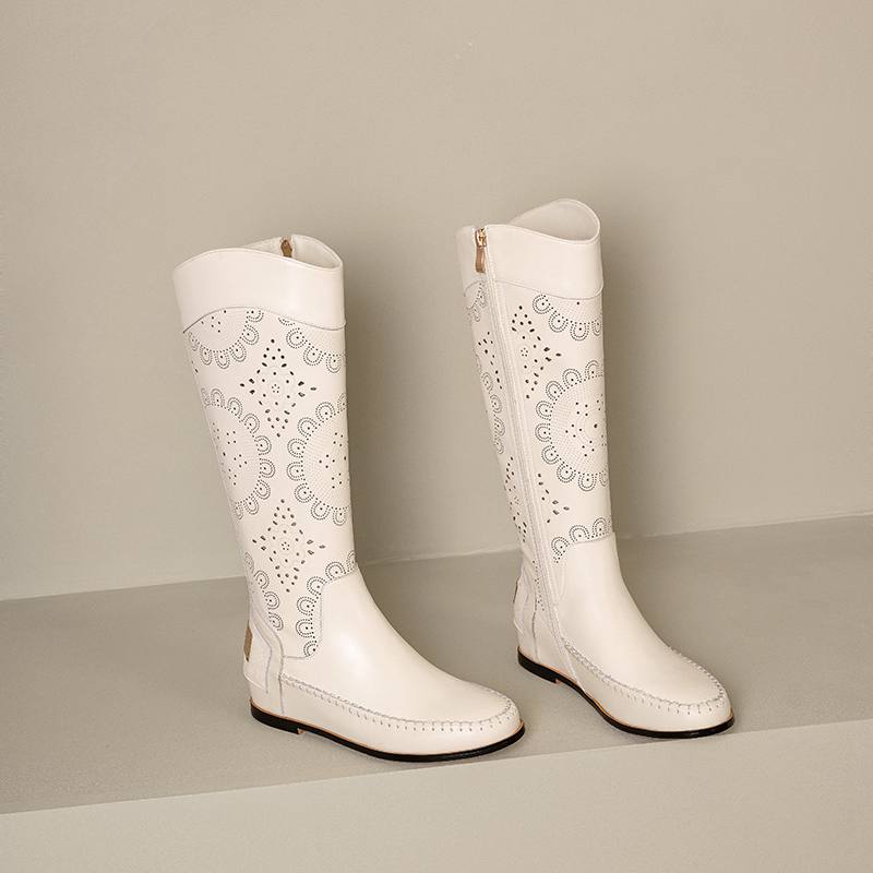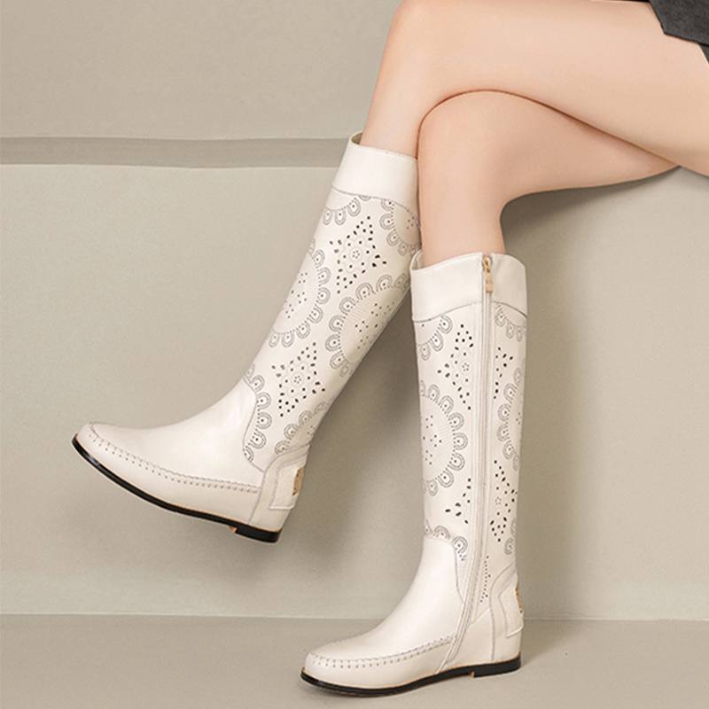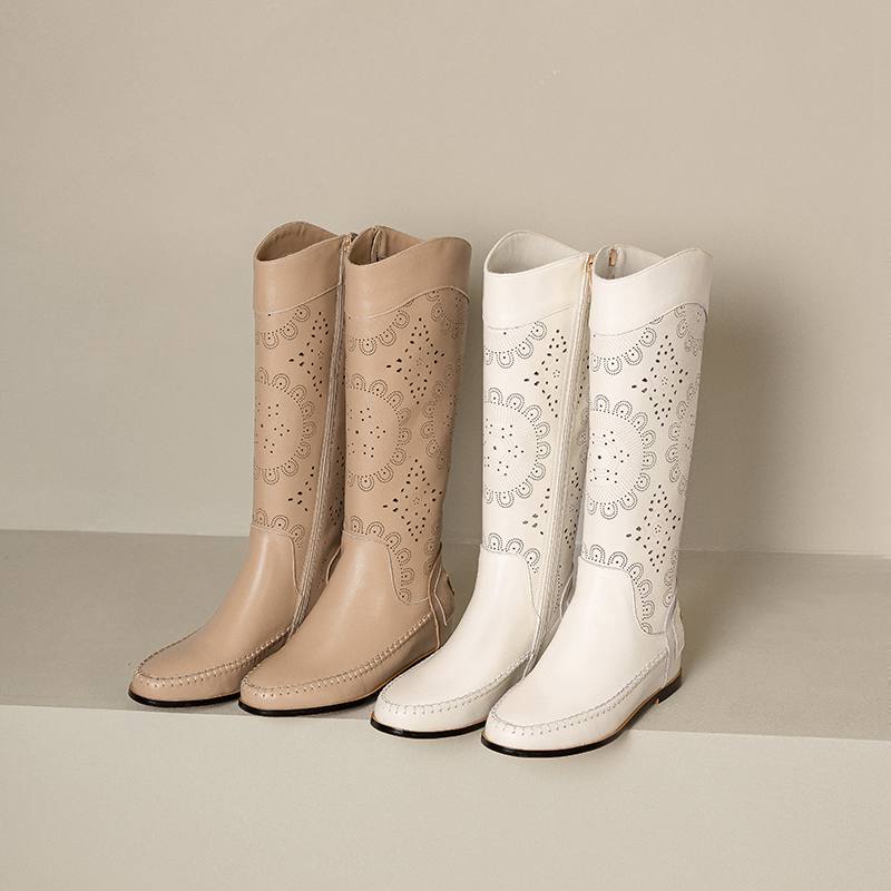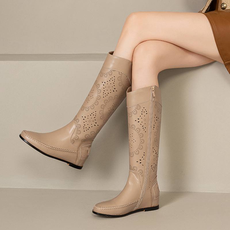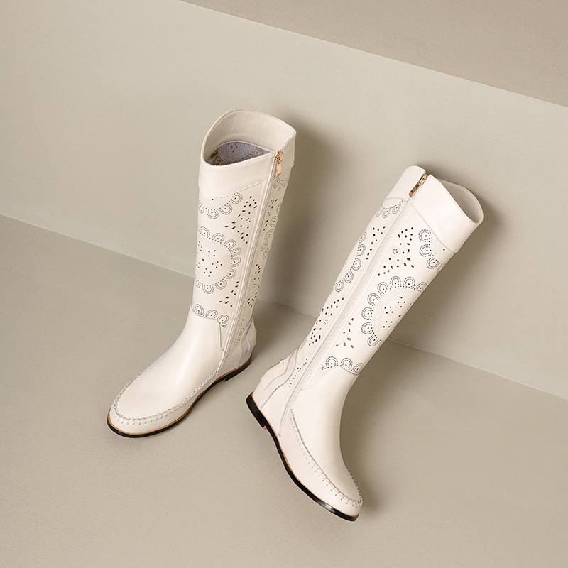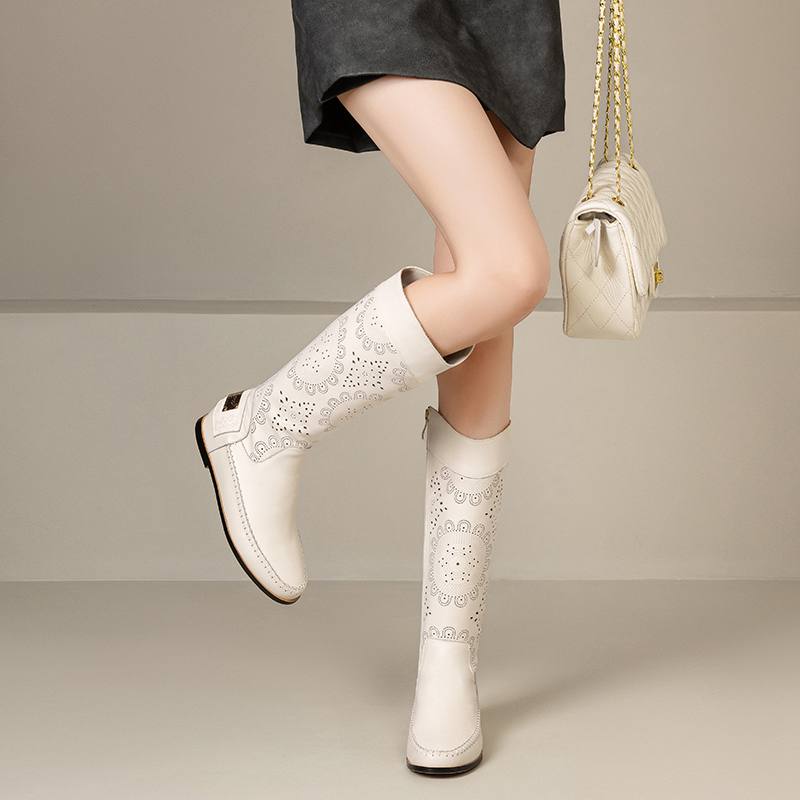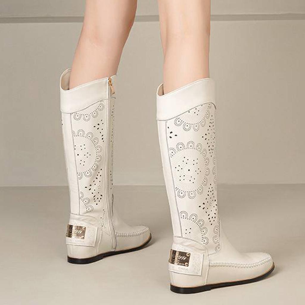 Krazing Pot Кожа спилка коровы Круглый носок Размер 43 Летние сапоги Модные рыцарские сапоги Полые украшения Осенние сапоги Ботфорты