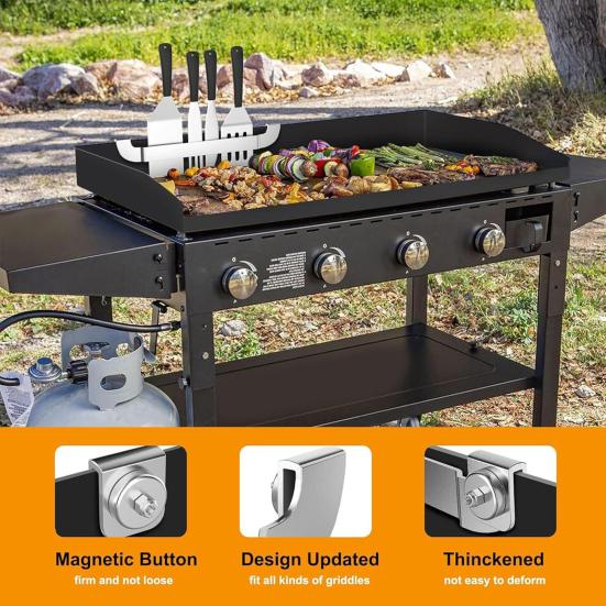 Легкость установки: Просто повесьте держатель для лопатки на стенку вашего противня для быстрой и надежной установки.. Магнитное крепление обеспечивает стабильную фиксацию, которую легко перемещать, что делает его подходящим для различных сковород-гриль, представленных на рынке, и идеальным для активного отдыха, такого как кемпинг и пикники.
