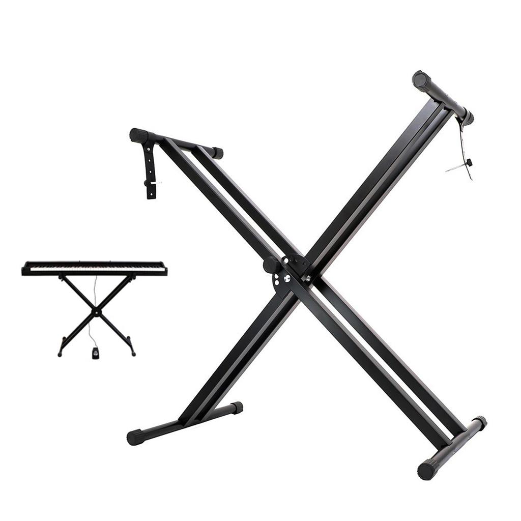 [6 уровней регулировки высоты] Высоту подставки можно регулировать от 49 до 97 см.. Двойная рамная конструкция диаметром 2,5 см легкая и надежно поддерживает клавиатуру, а прочная металлическая конструкция с двойным X-образным креплением совместима с различными электронными клавиатурами разных размеров.. Можно играть сидя или стоя.