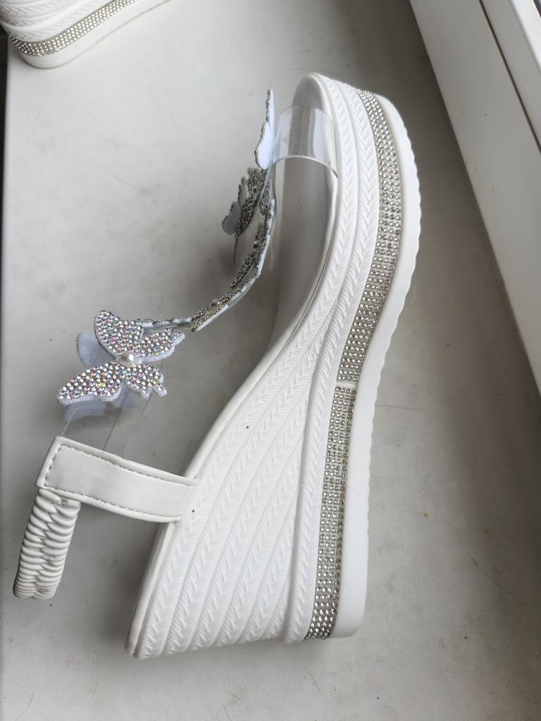 Женские босоножки на танкетке с открытым носком и жемчужинами-бабочками идеально подходят для теплой погоды. Они имеют толстую подошву, что обеспечивает комфорт при ношении. Модель выполнена без застежек, что делает их удобными в использовании. Материал покрытия: полиуретан Открытый носок для лучшей вентиляции Жемчужины-бабочки в дизайне Толстая подошва для устойчивости