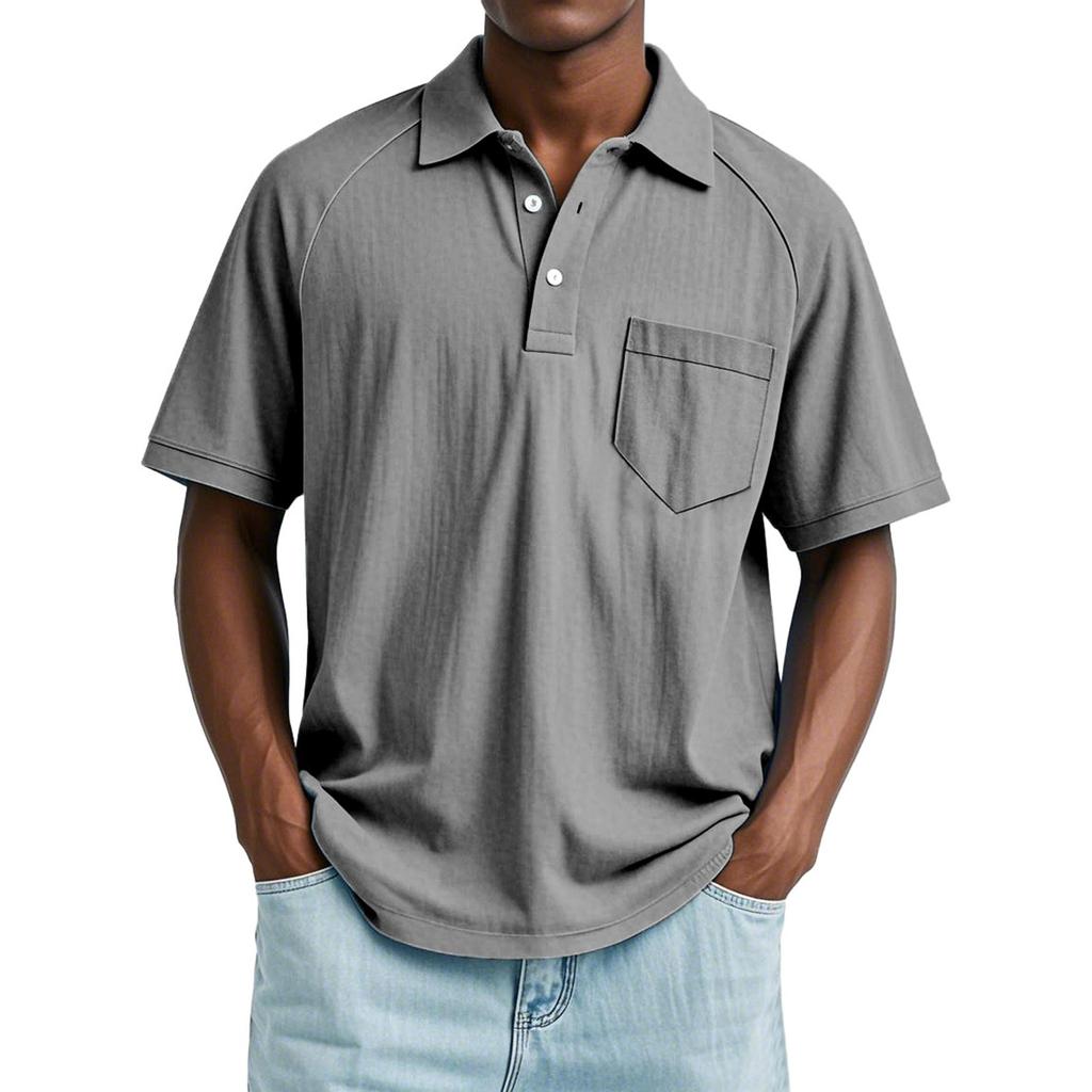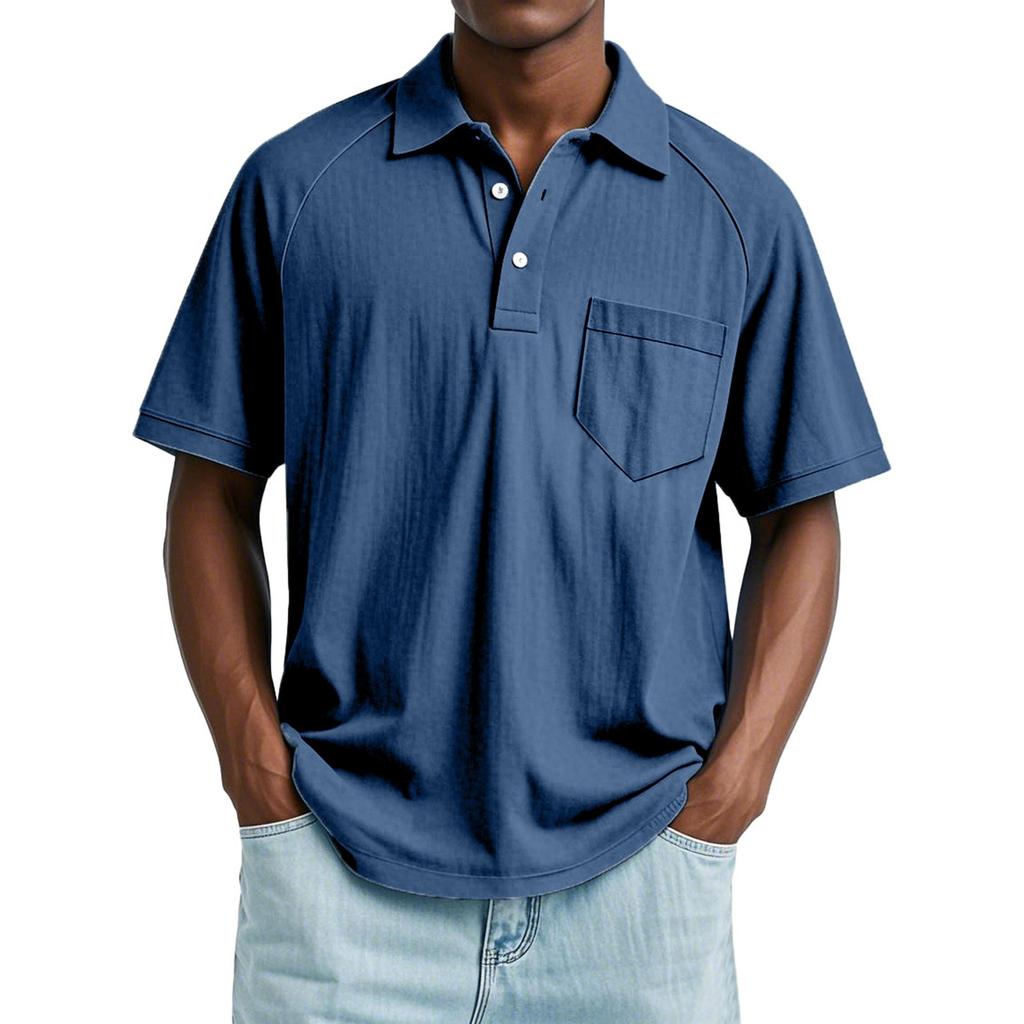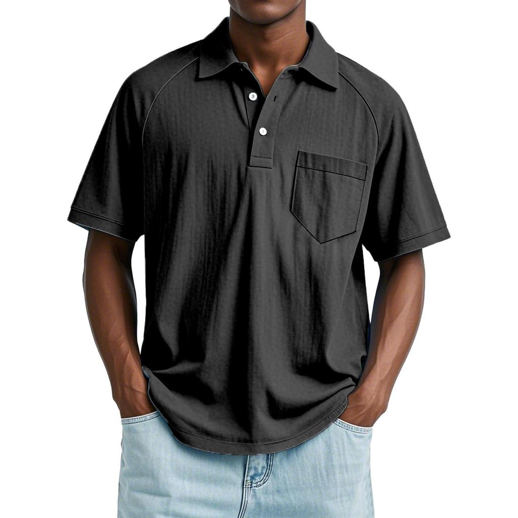 Мужской летний однотонный топ с лацканами, карманом на пуговице, свободного кроя, с рукавами реглан и короткими рукавами