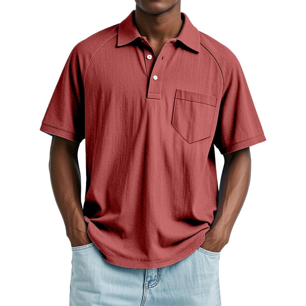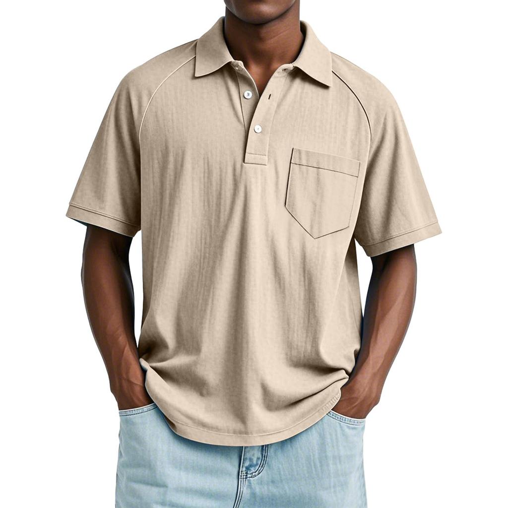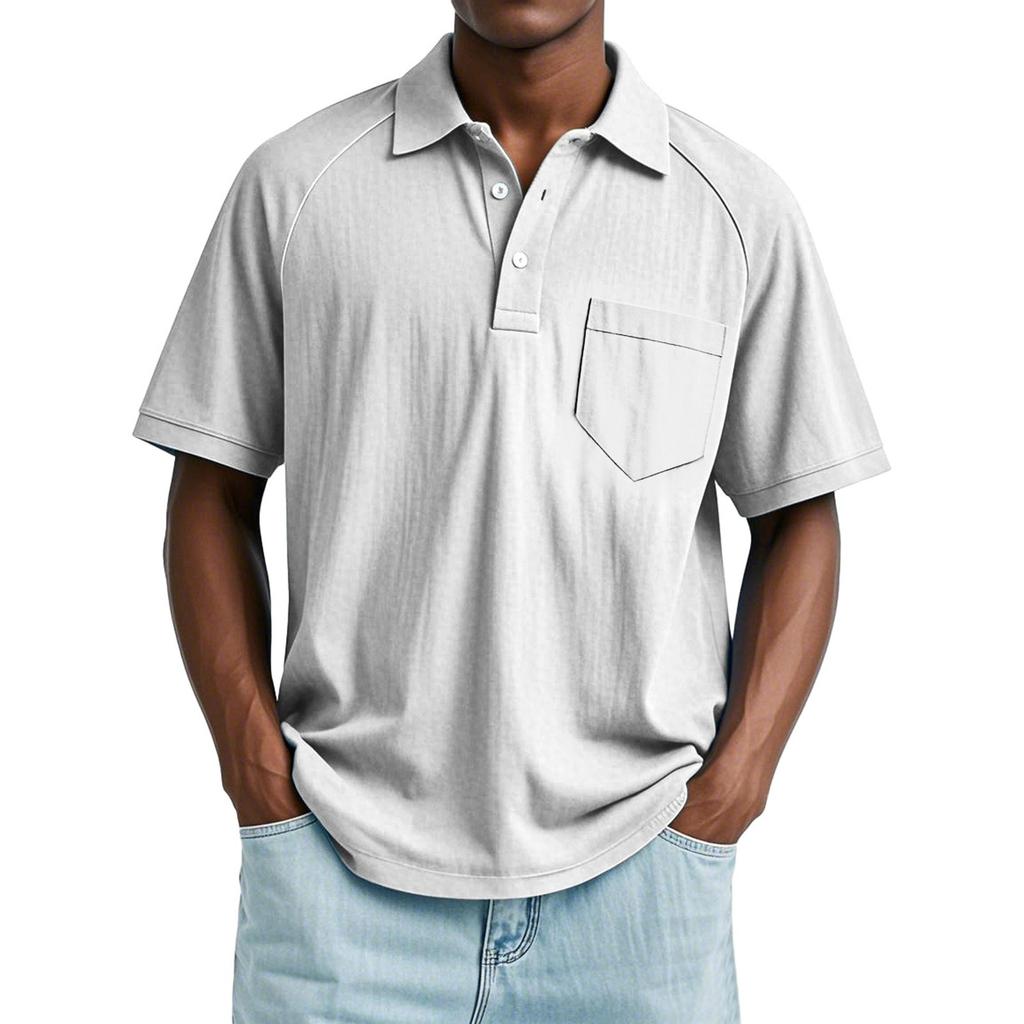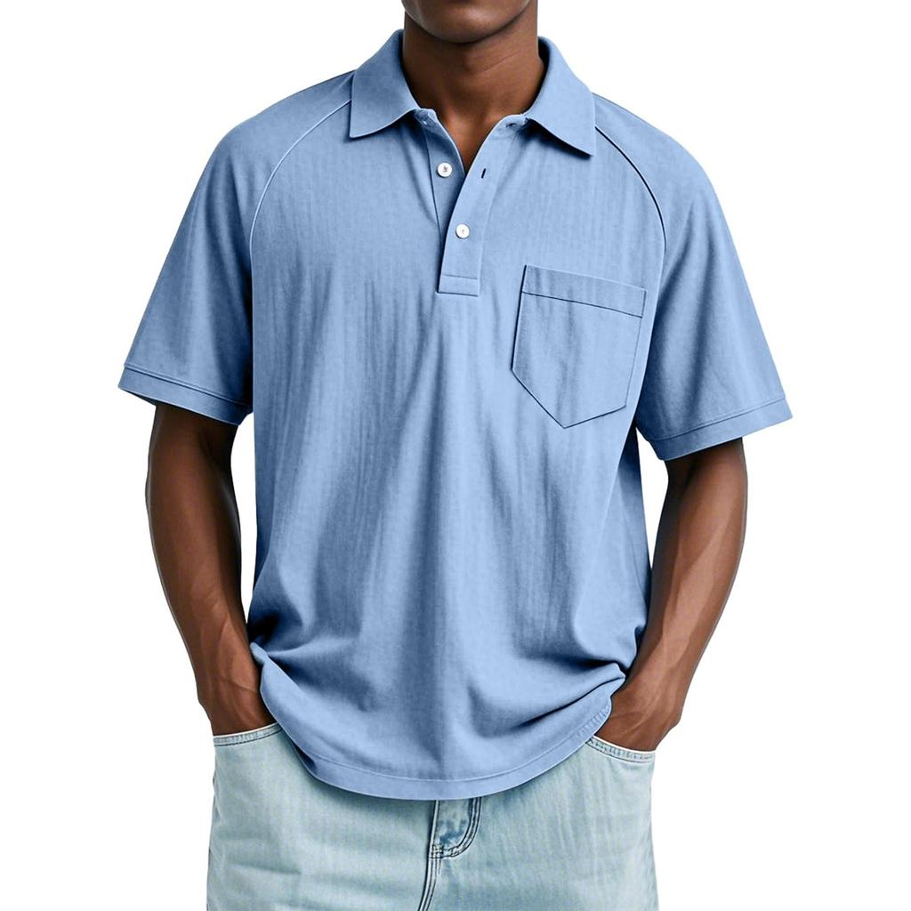 Мужской летний однотонный топ с лацканами, карманом на пуговице, свободного кроя, с рукавами реглан и короткими рукавами