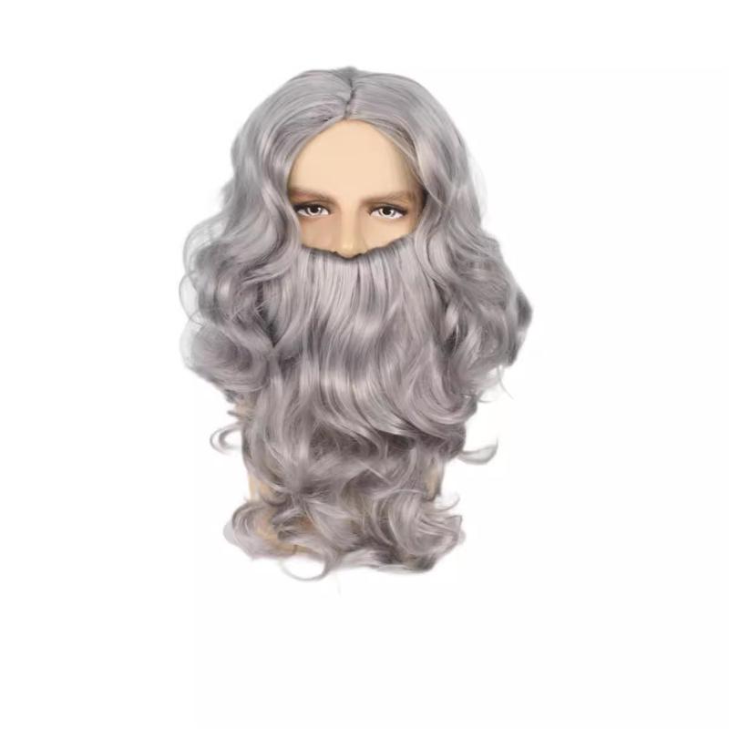 Синтетическая борода и парики Наборы Короткий седой старик Кудрявый парик Костюм Зевса для косплея Серый для мужчин Карнавал Рождественская вечеринка