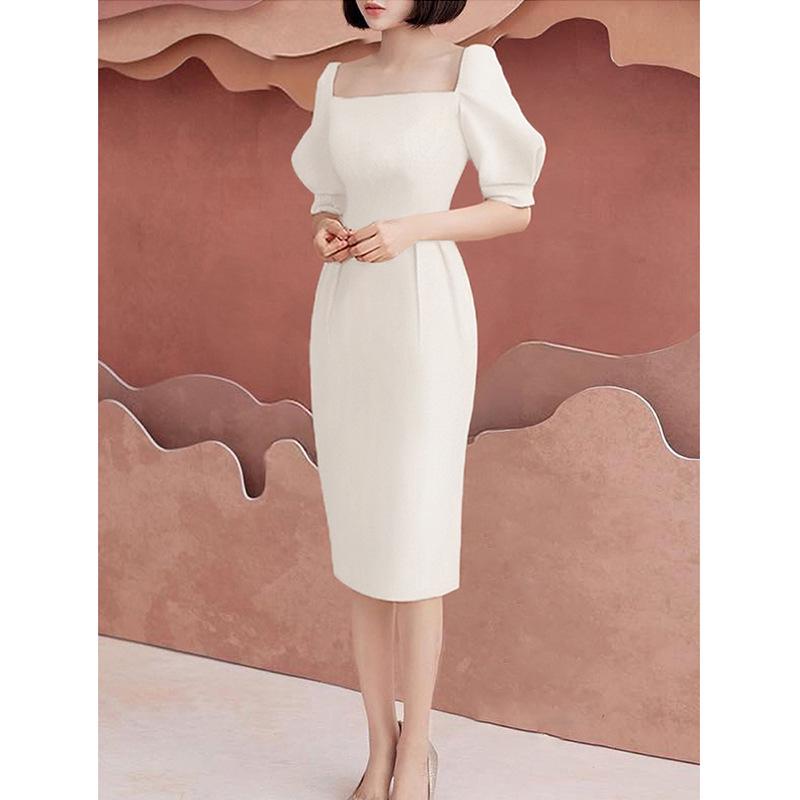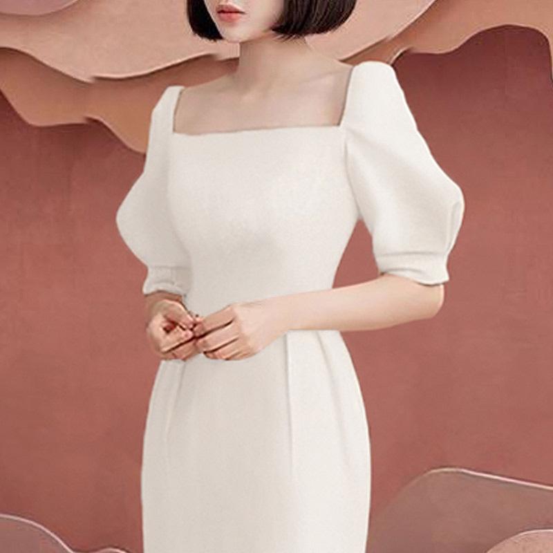 2020 Французский стиль светской львицы Квадратный вырез Пышный рукав Высокая талия Приталенное Белое вечернее платье