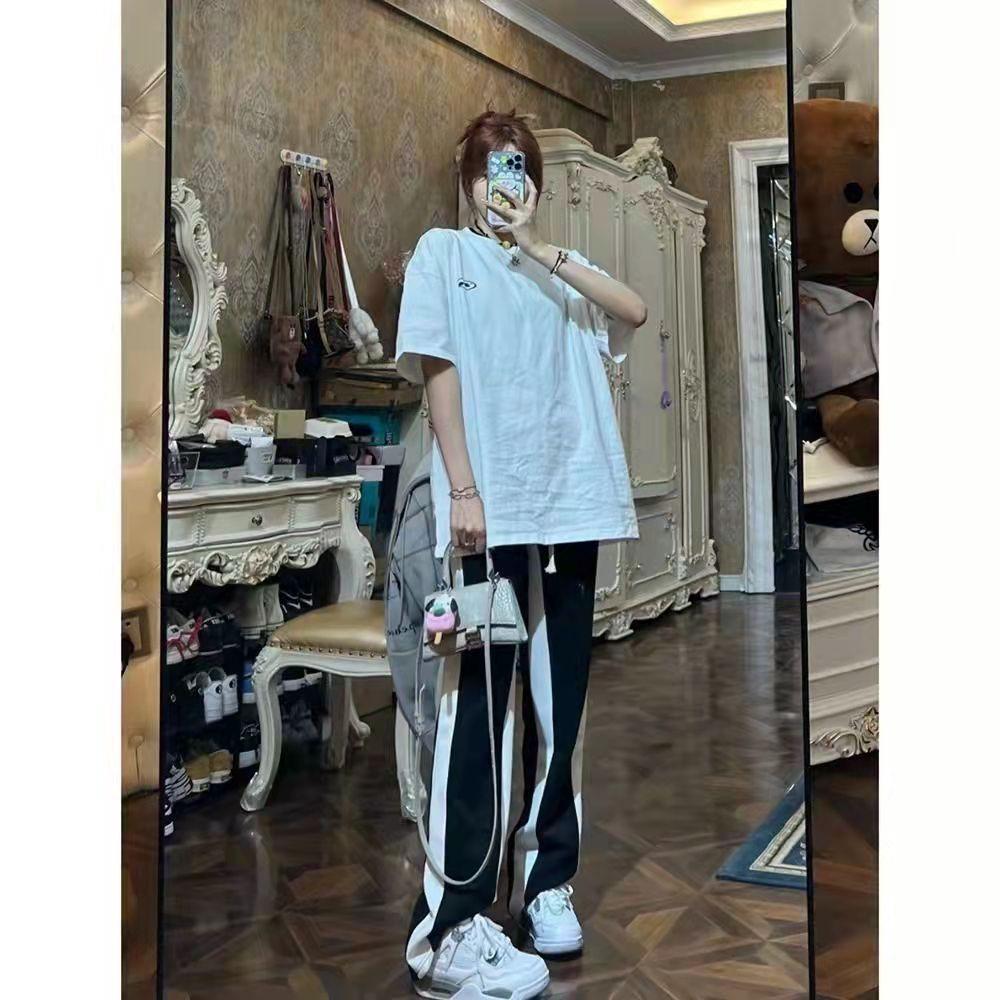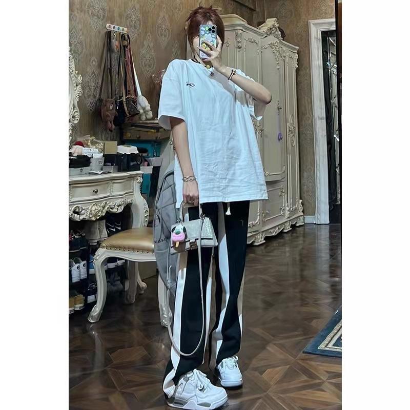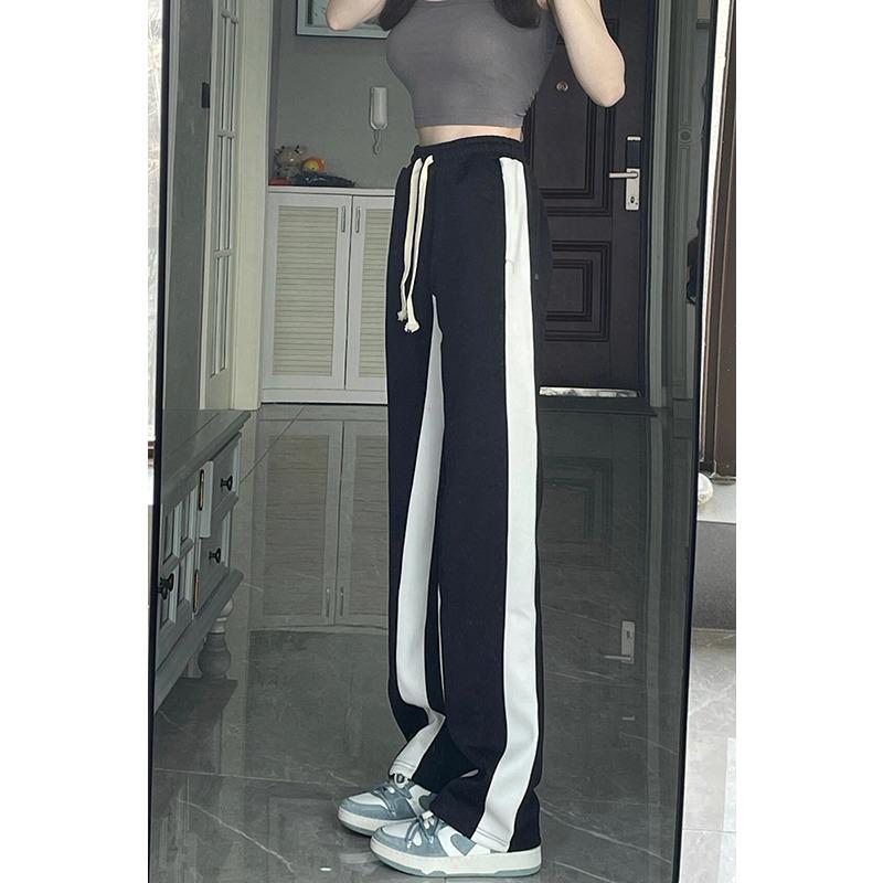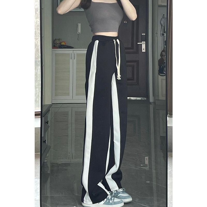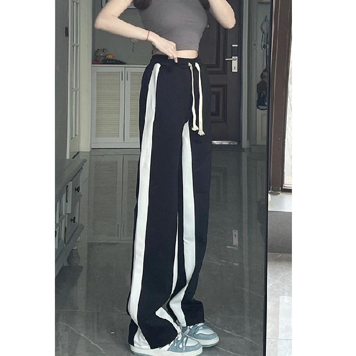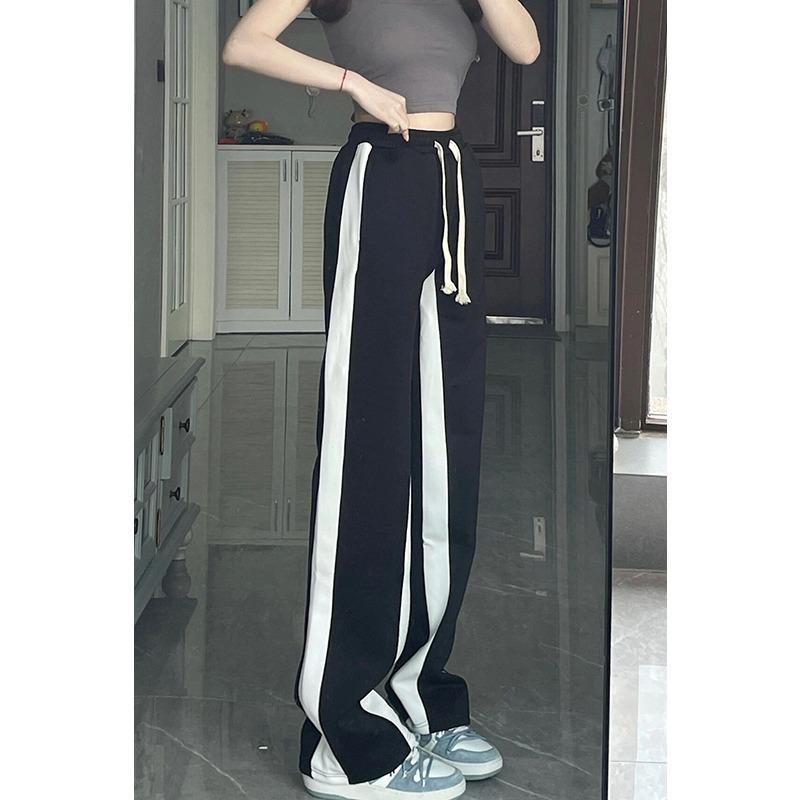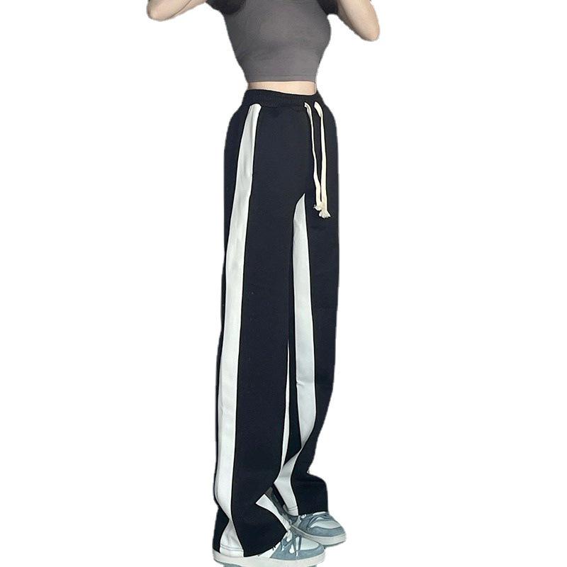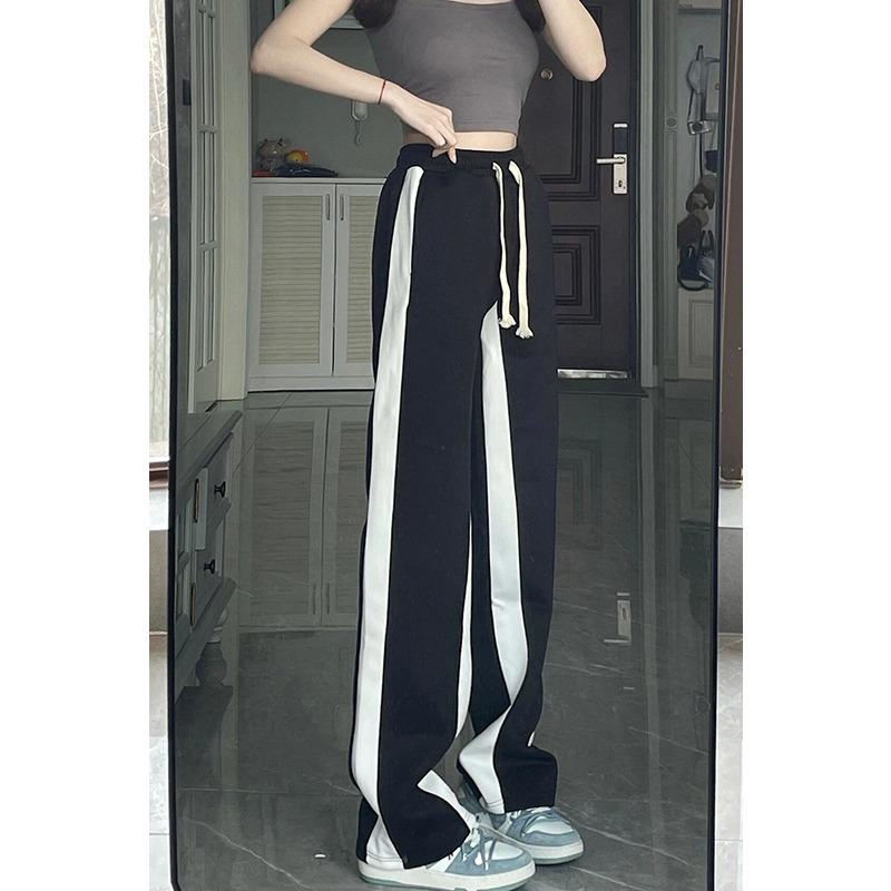 Черно-белые брюки с широкими штанинами и боковыми полосками - Свободные, Повседневные, Драпирующиеся до пола, Трикотажные брюки прямого кроя для лета