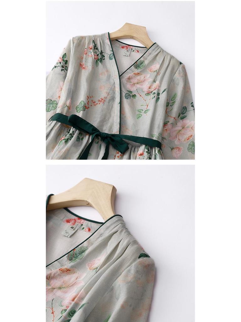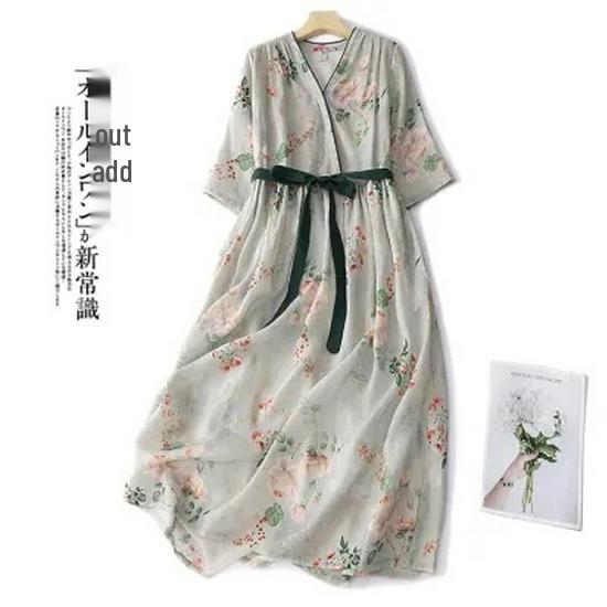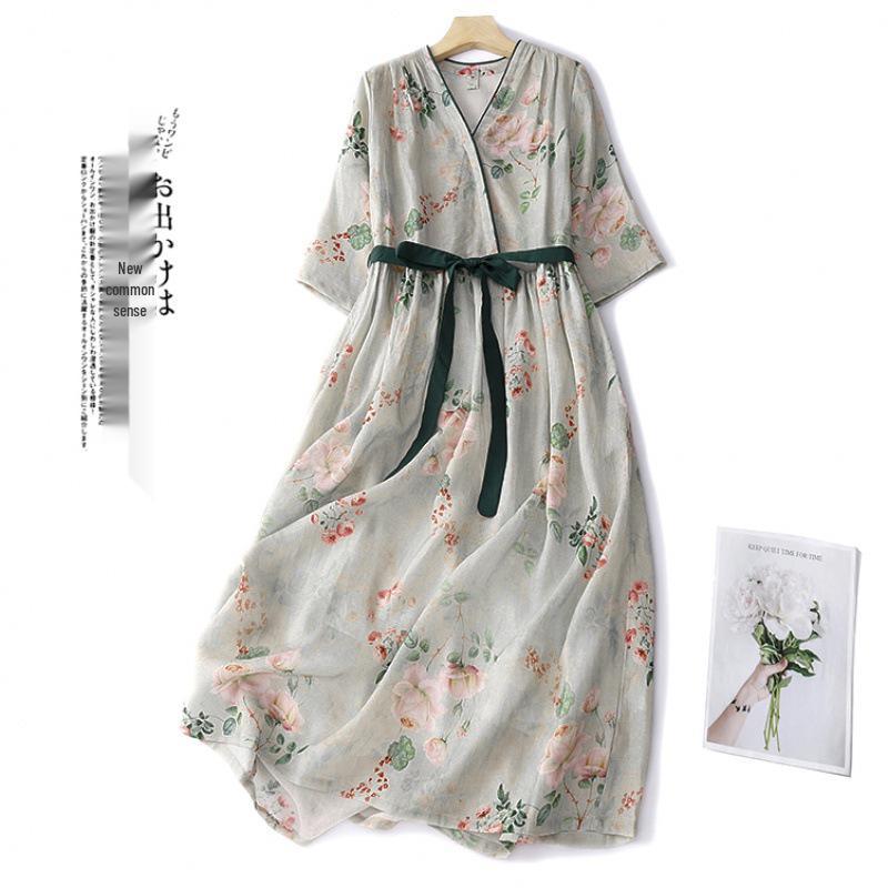 Летнее ретро платье макси из хлопка и льна в стиле пэчворк с завышенной талией и эффектом похудения для женщин - Большой размер
