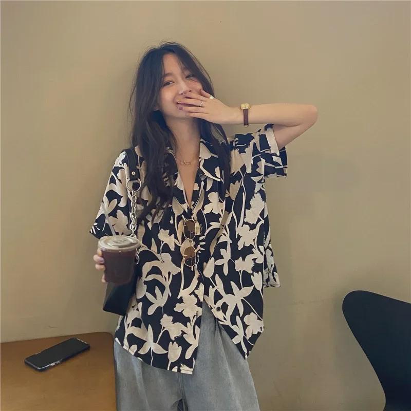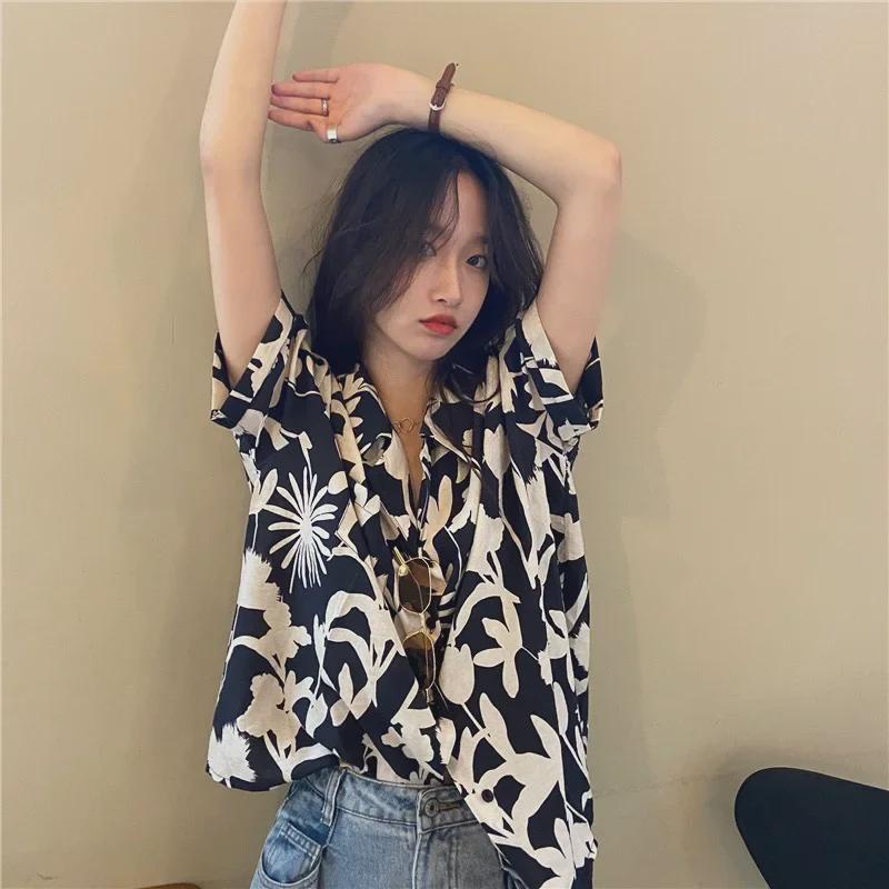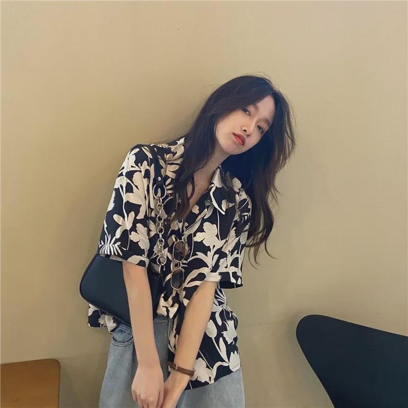 Женская летняя рубашка с ретро-принтом кикё, гонконгский шик, стиль BF Харадзюку, короткий рукав, нежный дизайн.