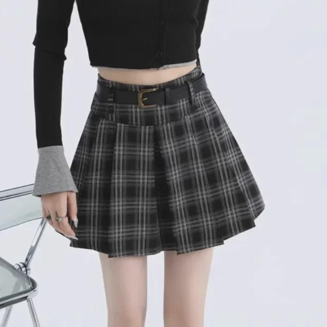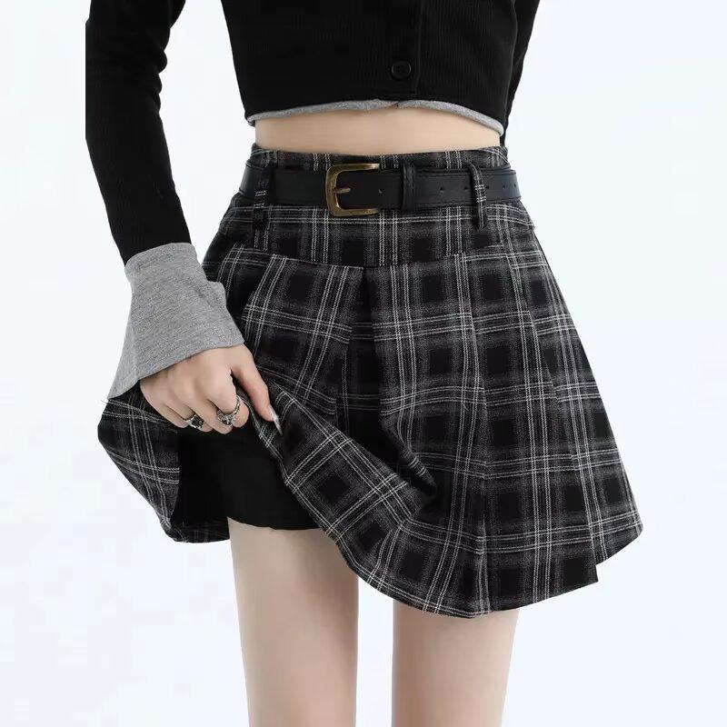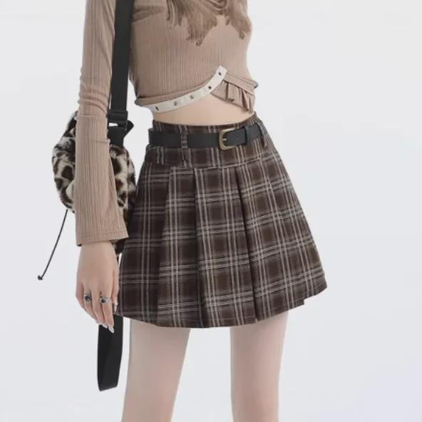 Женская юбка А-силуэта в клетку с высокой посадкой и плиссировкой - Ретро осенне-зимний стиль, Стройнящая, Покрытие бедер, Короткая длина
