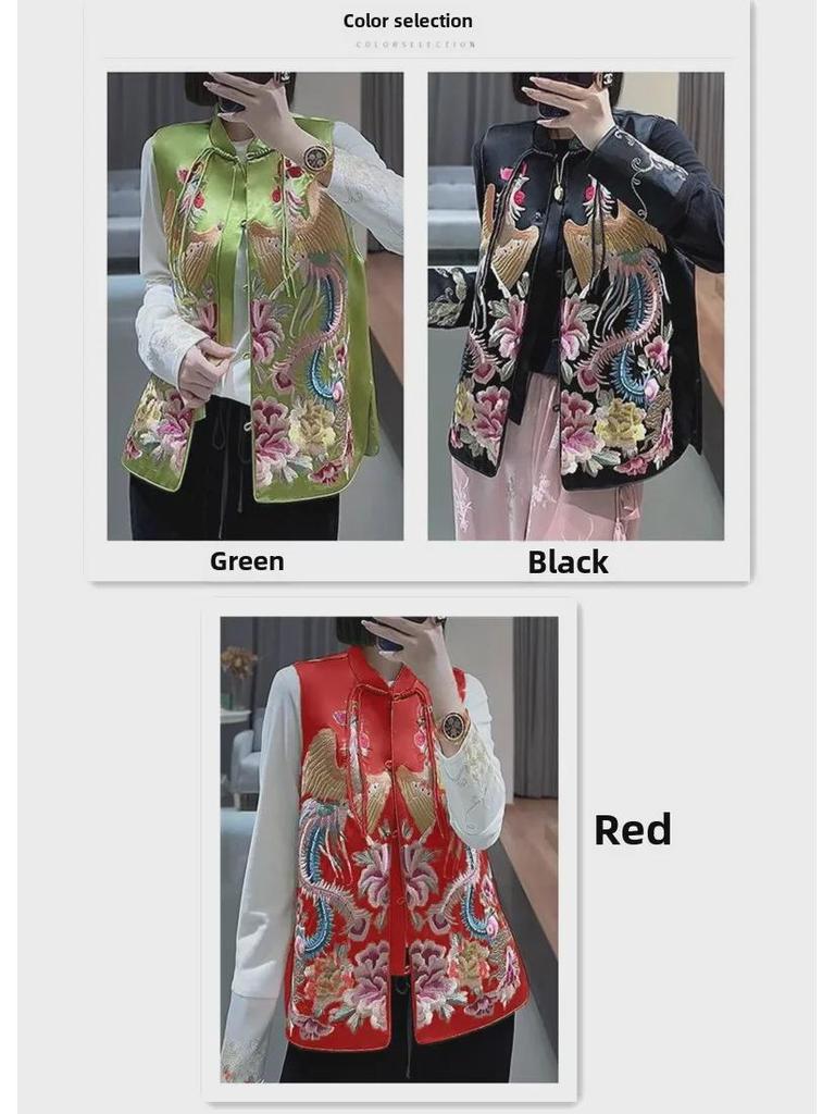 Оцените сочетание традиционной элегантности и современной моды с этим изысканным женским жилетом, идеальным для весенне-летнего сезона.. Жилет, украшенный изысканной вышивкой с изображением феникса, демонстрирует потрясающее проявление искусства в национальном китайском стиле.. Изготовленный из высококачественного полиэстера, он обеспечивает прочность и комфорт.. Воротник-стойка добавляет нотку изысканности, а свободный крой обеспечивает легкость и свободу движений.. Идеальный для добавления уникального и культурного колорита в ваш гардероб, этот жилет создан для тех, кто ценит красоту фьюжн-моды.