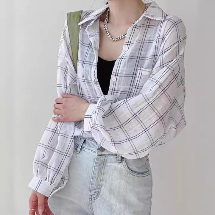 Рубашка в клетку свободного кроя в корейском стиле с длинным рукавом - Женский модный топ для защиты от солнца