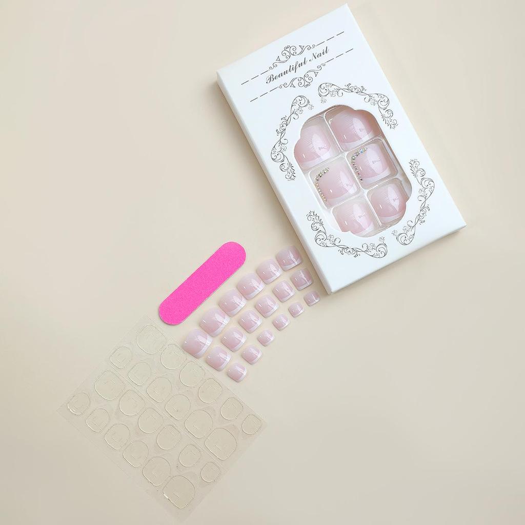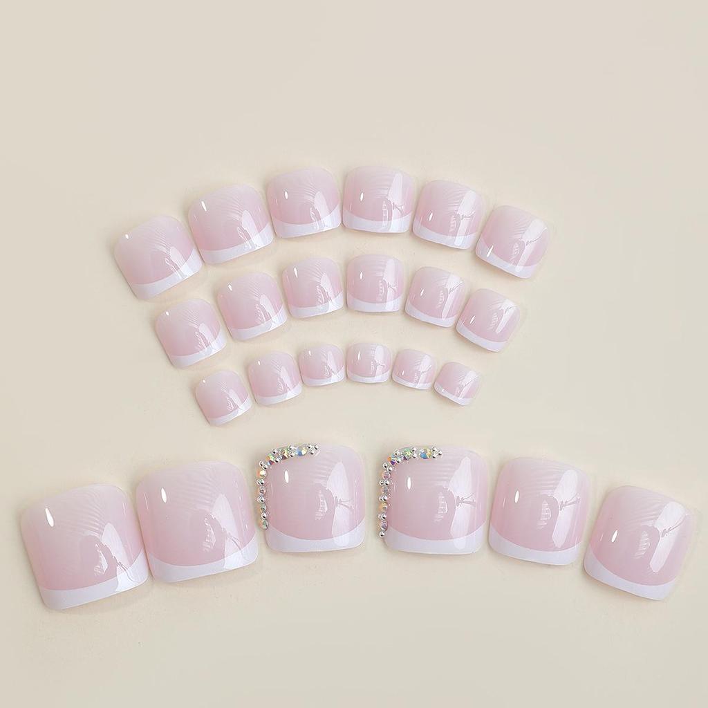 Съемные накладные короткие ногти на ногах: Белый французский край со стразами наклейки для накладных ногтей