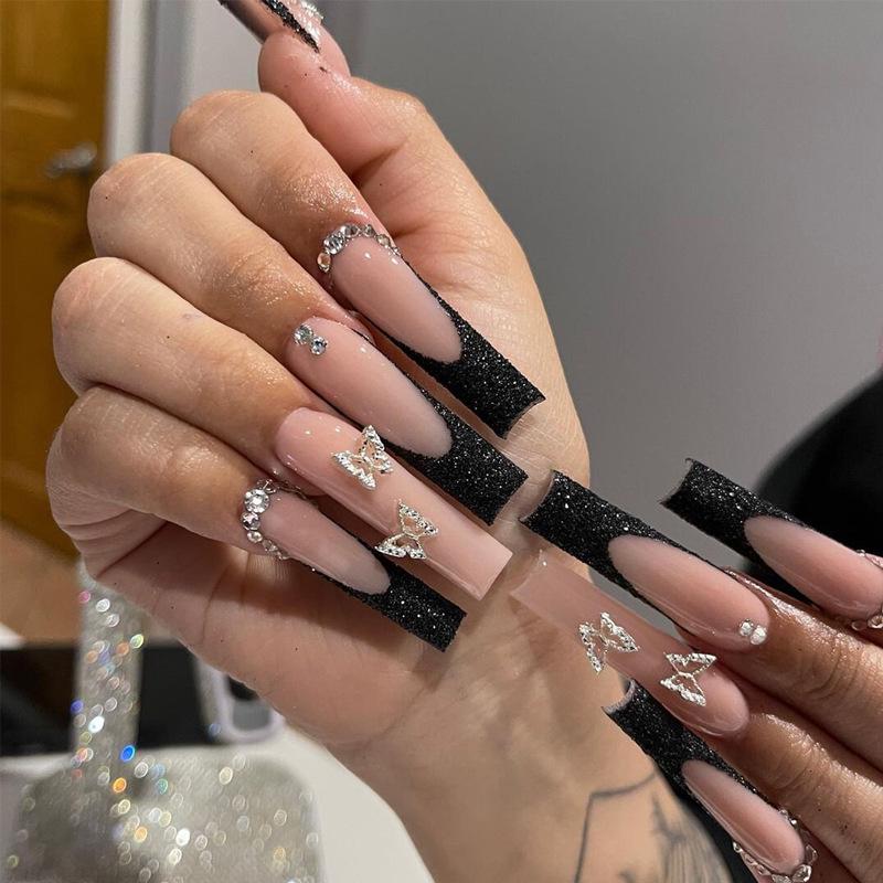 Серебристые стразы Бабочка Длинные накладные ногти - Сладкие и Крутые Маникюрные типсы