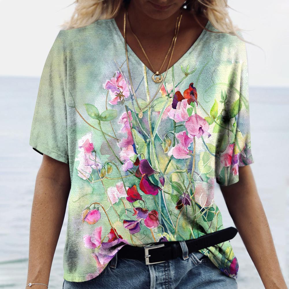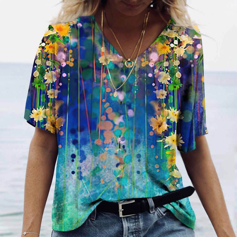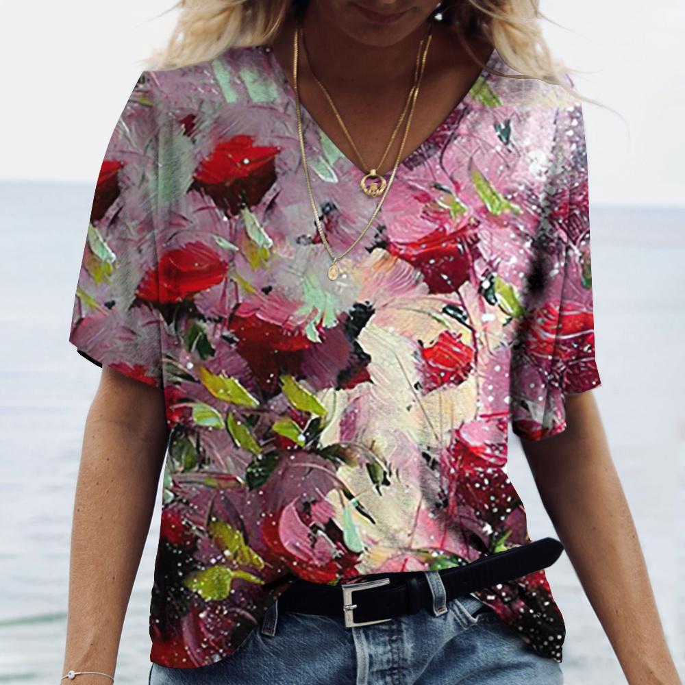 Женская футболка 3D с V-образным вырезом, с цветочным принтом, одежда оверсайз, блузка с коротким рукавом, мода Харадзюку, летняя женская красивая