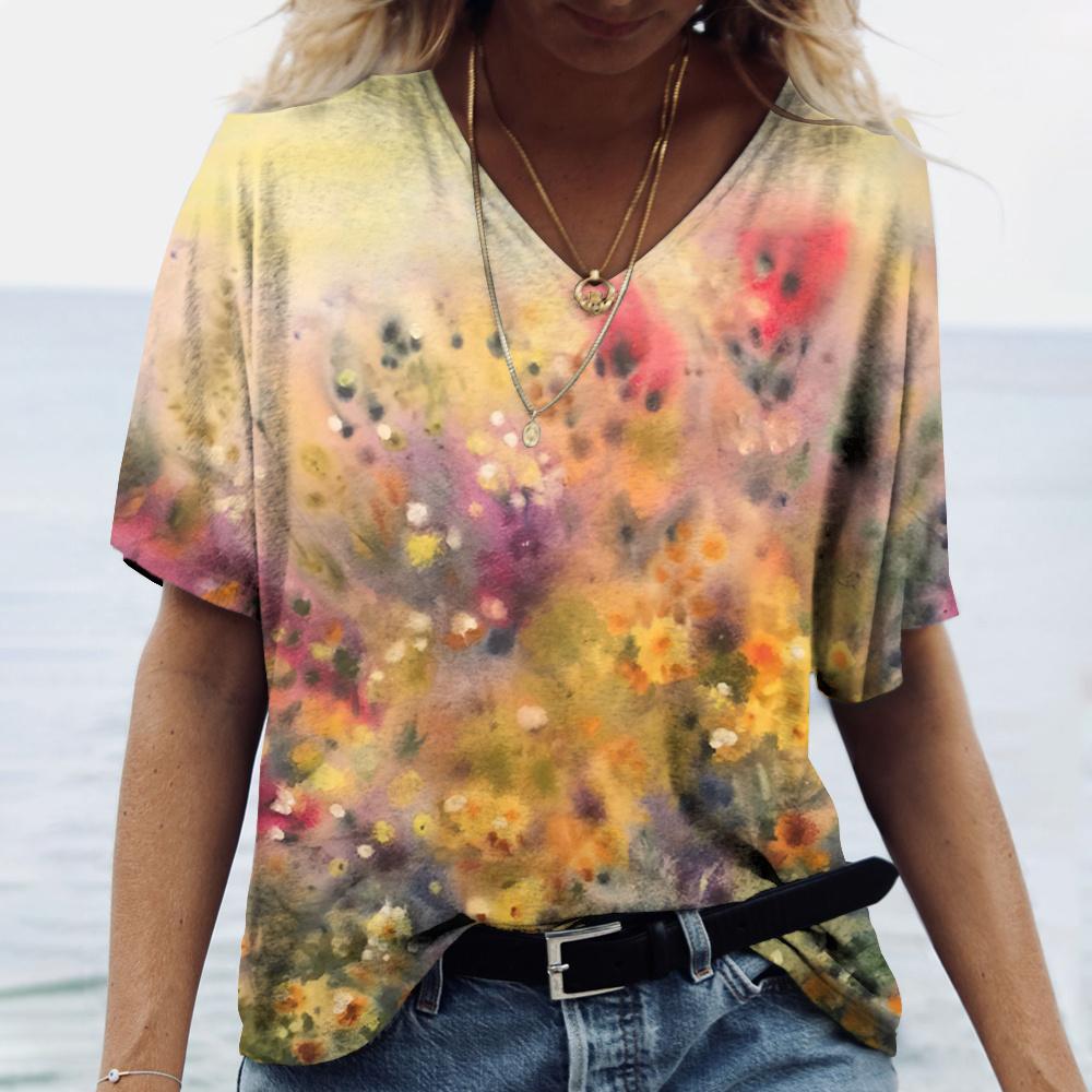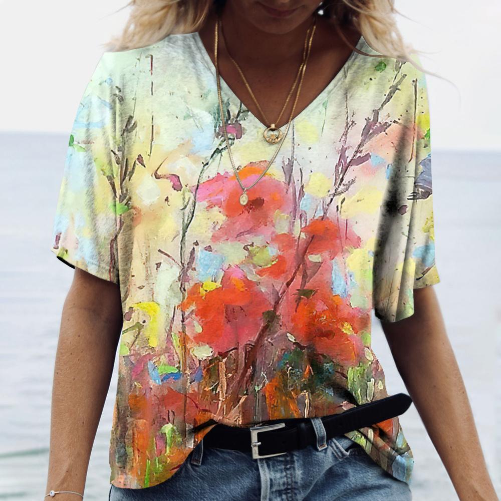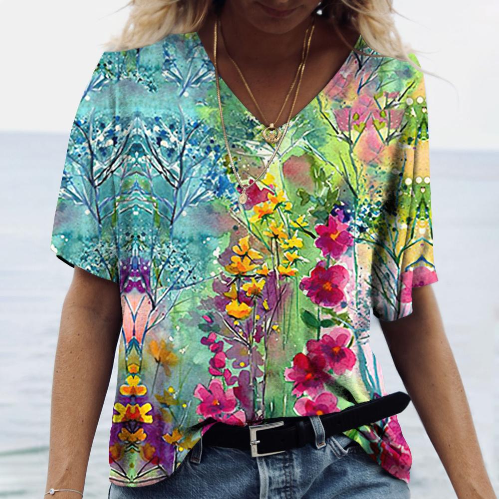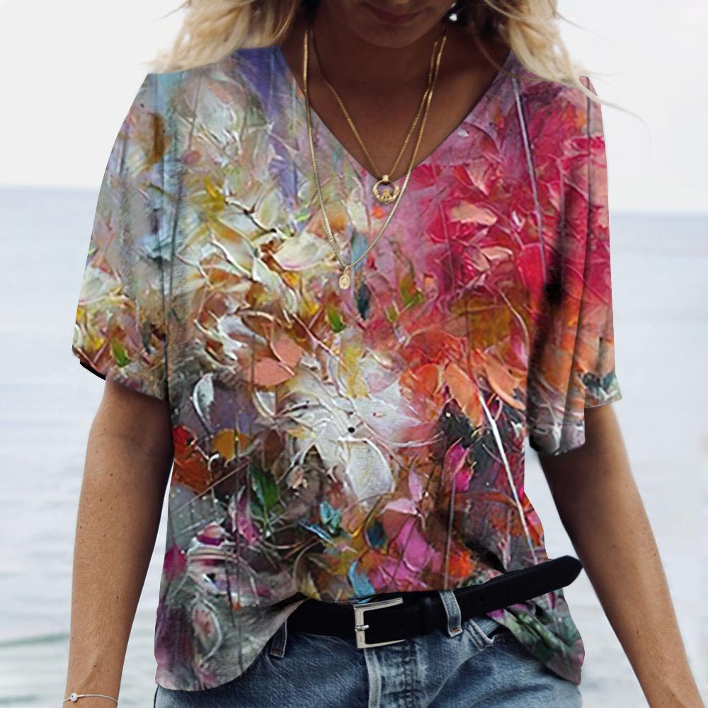 Женская футболка 3D с V-образным вырезом, с цветочным принтом, одежда оверсайз, блузка с коротким рукавом, мода Харадзюку, летняя женская красивая