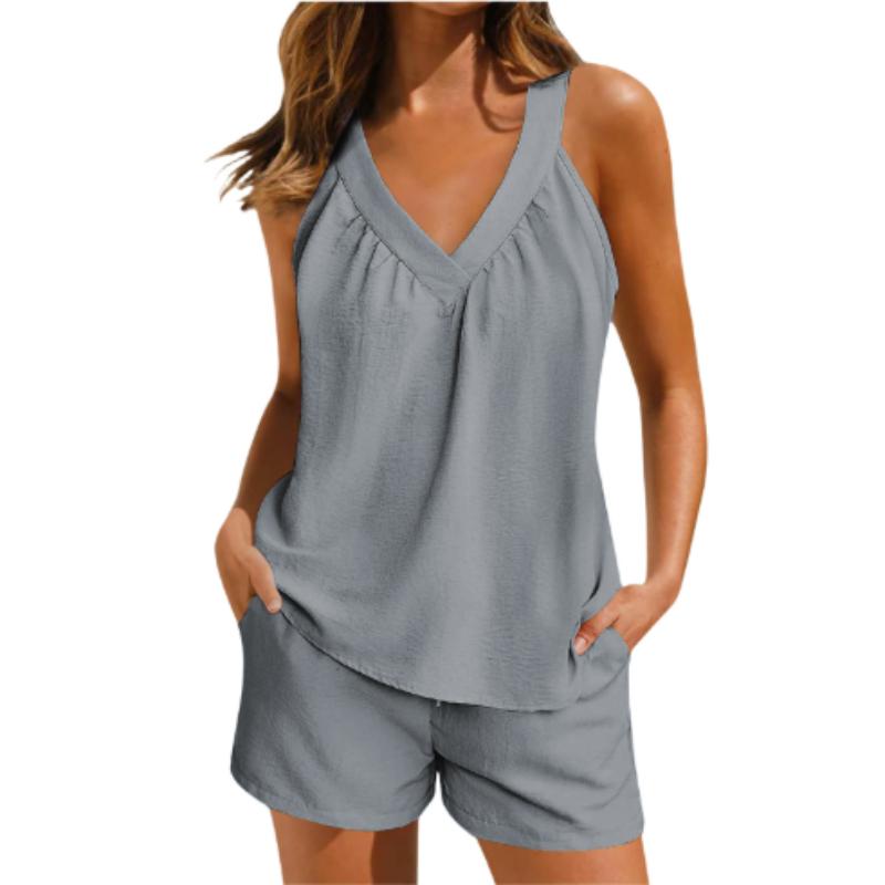 Женский однотонный свободный пуловер с v-образным вырезом, повседневный топ без рукавов с карманами, шорты, комплект
