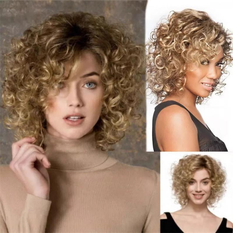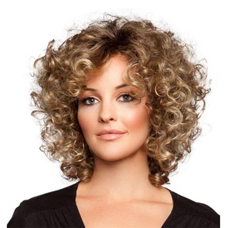 Синтетические парики для женщин Короткие кудрявые волосы Смешанный блонд парик с челкой Натуральная прическа Парик для мамы Повседневная носка Парики для замены волос