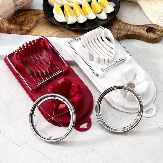 Оснащенный металлической режущей линией, этот слайсер для яиц обеспечивает точные и равномерные ломтики вареных яиц с легкостью.. Его легкая и складная конструкция делает его удобным в использовании и идеальным для компактного хранения на любой кухне.. Благодаря двум вариантам нарезки, без труда создавайте круглые или в форме цветка ломтики яиц или клубники.