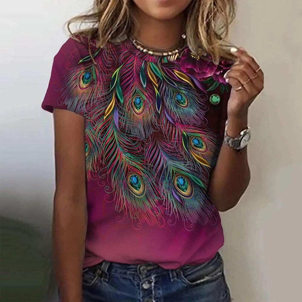 Летняя повседневная футболка с коротким рукавом и круглым вырезом для женщин, с 3D-принтом павлиньих перьев, уличная одежда, модная