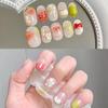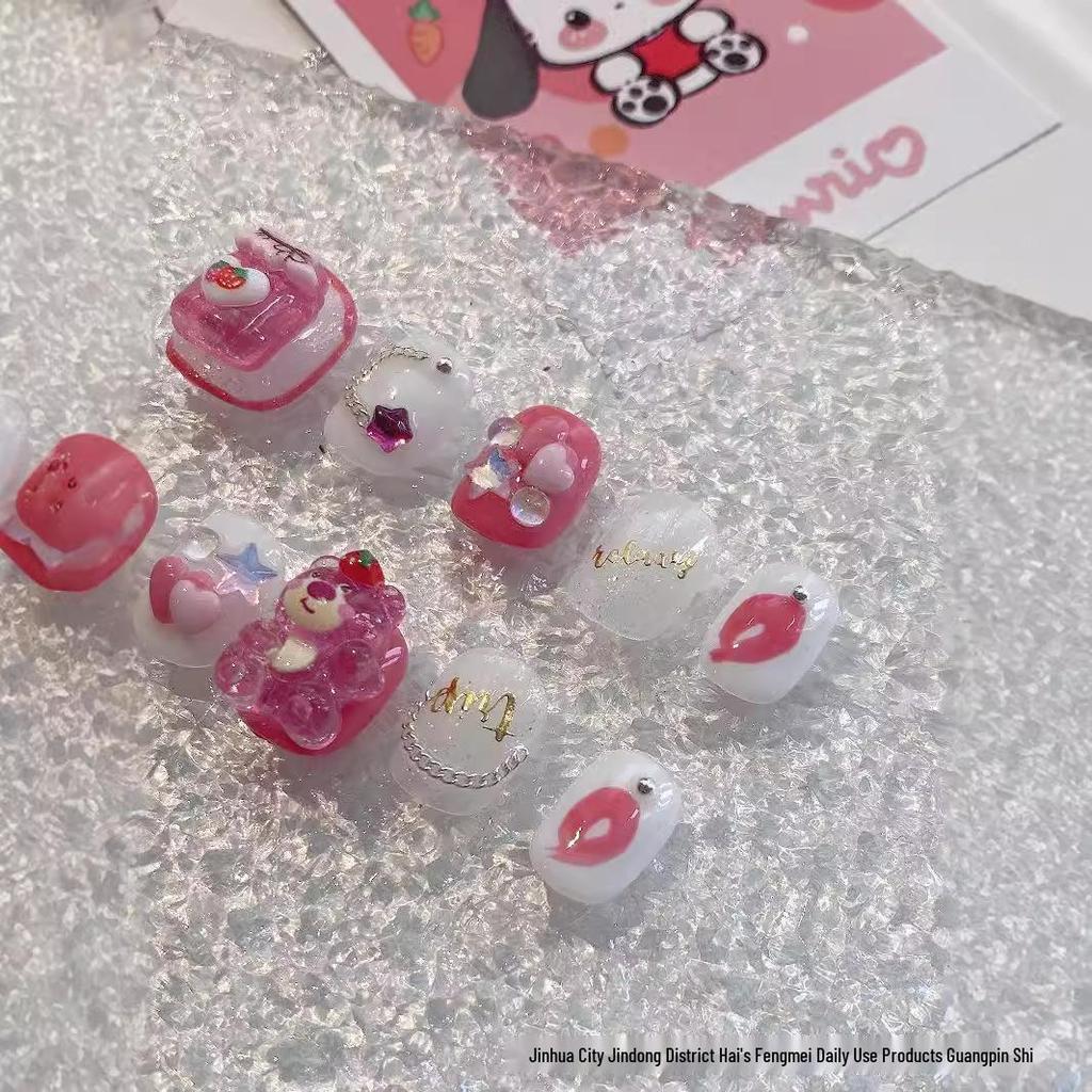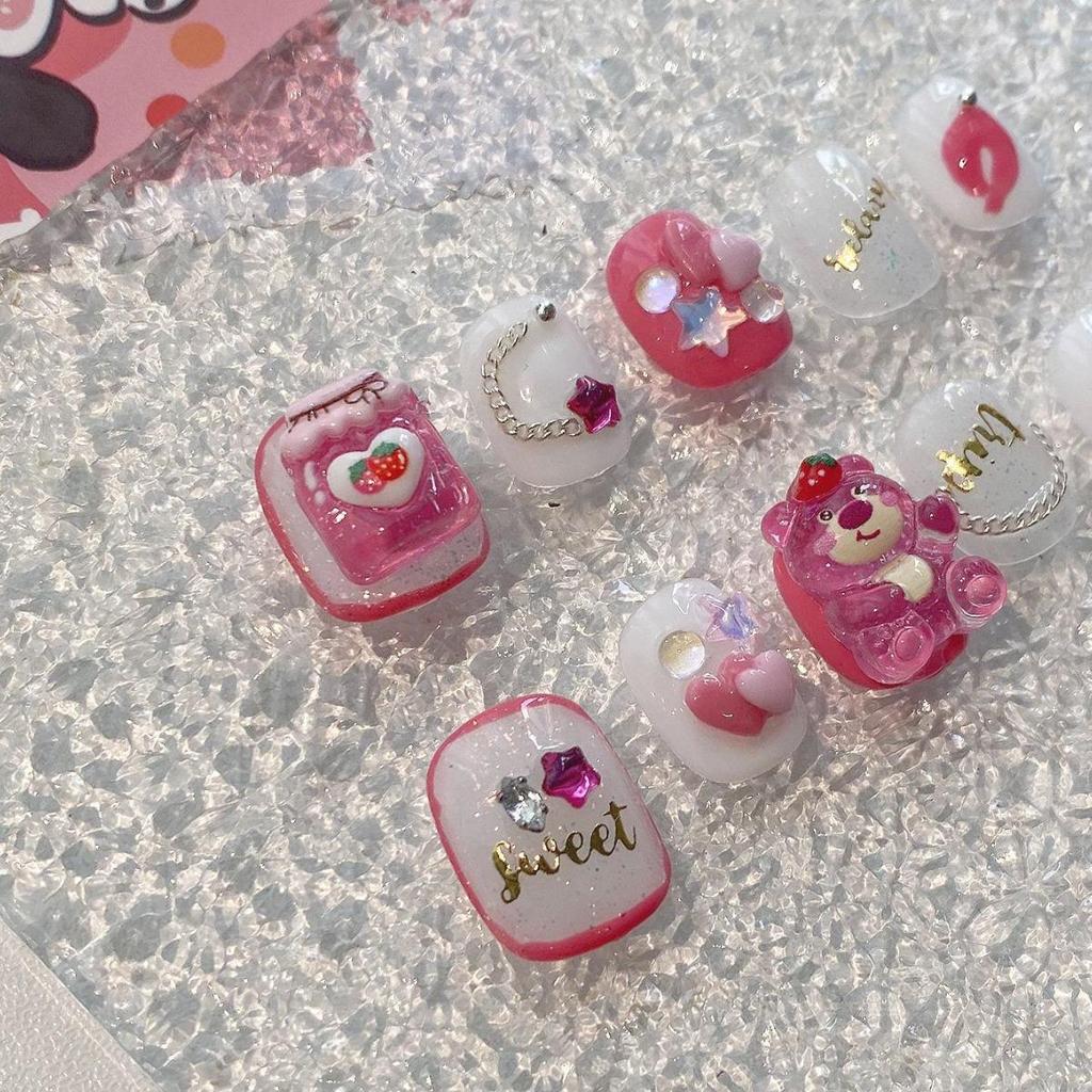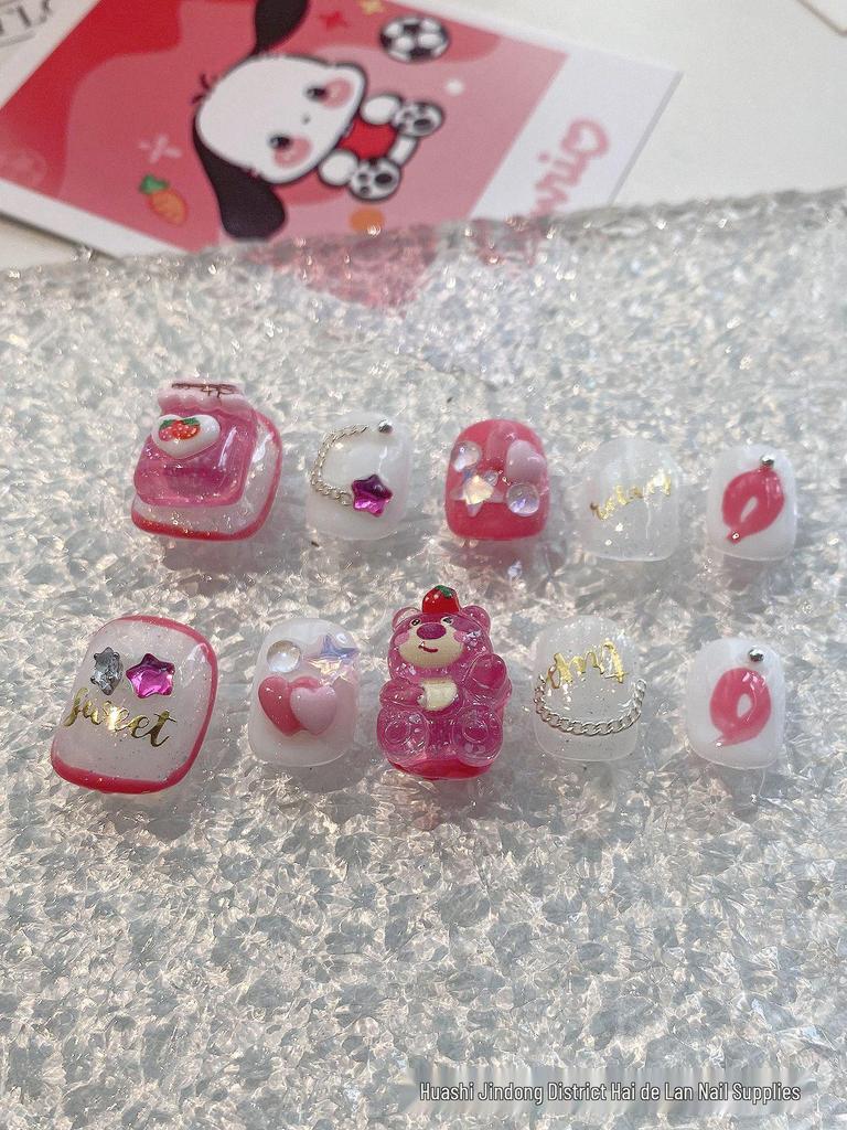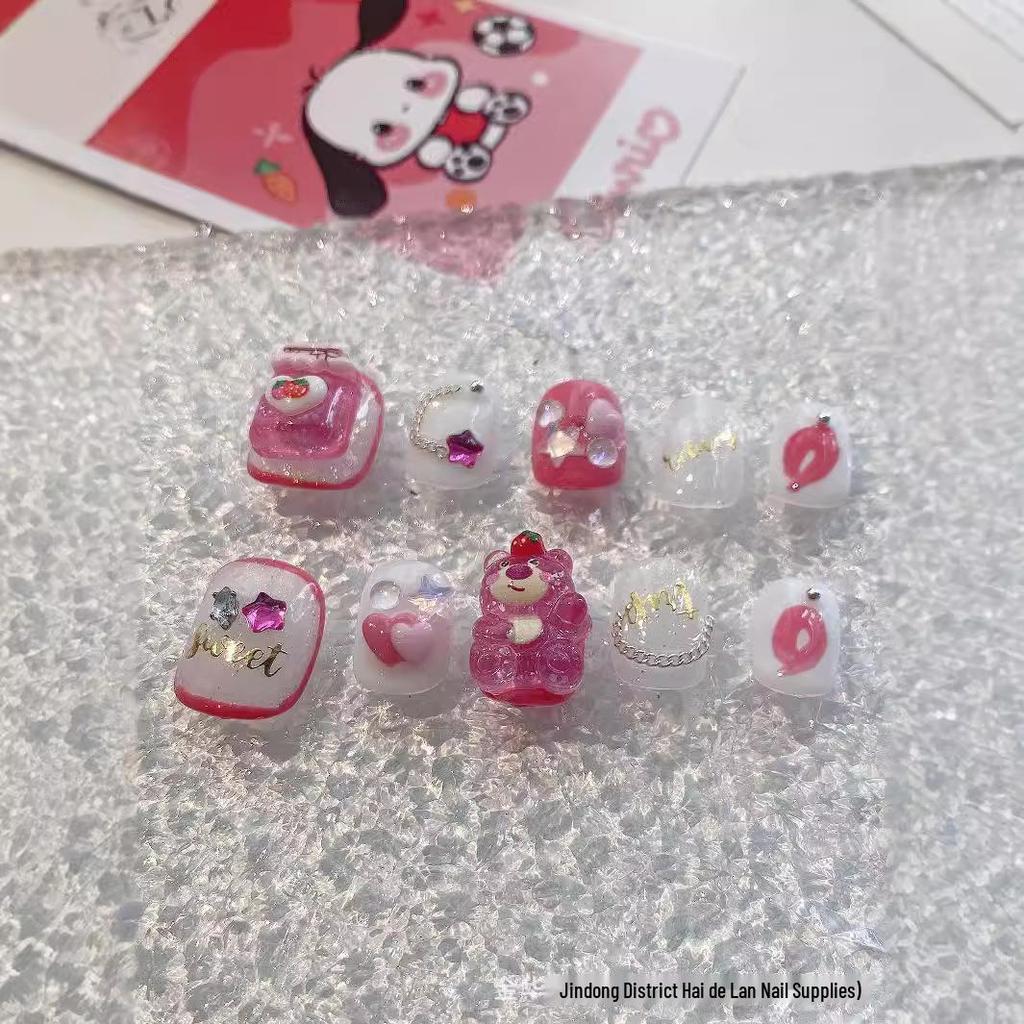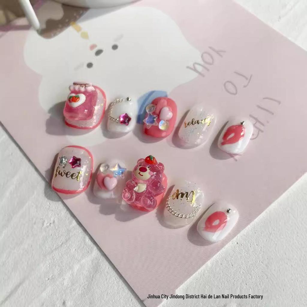 Короткие накладные ногти «Клубничный медведь» - Милый мультяшный дизайн, Нежное отбеливание, Готовые маникюрные патчи ручной работы