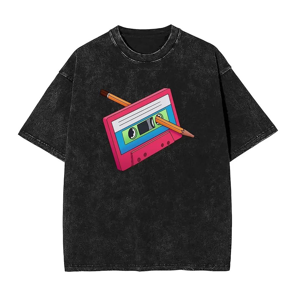 Винтажная футболка с кассетой и карандашом, розовая, футболки Харадзюку, футболка с коротким рукавом, уличный стиль, летняя одежда оверсайз