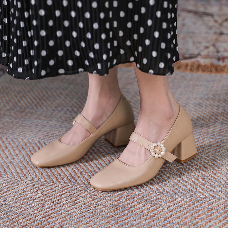 Жемчужные туфли-лодочки женские весенние нежные школьные на толстом каблуке ретро с мелким вырезом Мэри Джейн