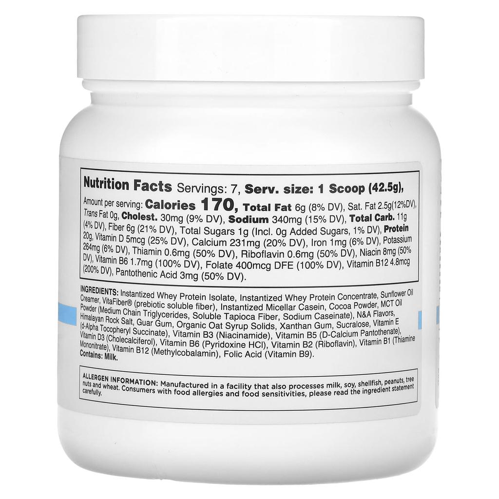 Ингредиенты: Изолят сывороточного протеина быстрого приготовления, инстантизированный концентрат сывороточного протеина, подсолнечный кремер, VitaFiber® (пребиотическая растворимая клетчатка), быстрорастворимый мицеллярный казеин, какао-порошок, порошок масла МСТ (триглицериды средней цепи, растворимые волокна тапиоки, казеинат натрия), ароматизатор, гималайская розовая соль, гуаровая камедь, органические сухие вещества овсяного сиропа, ксантановая камедь, сукралоза, витамин Е (d-альфа токоферола сукцинат), витамин B3 (ниацинамид), витамин В5 (d-пантотенат кальция), витамин D3 (холекальциферол), витамин В6 (пиридоксин гидрохлорид), витамин В2 (рибофлавин), витамин В1 (мононитрат тиамина), витамин В12 (метилкобаламин), фолиевая кислота (витамин В9). Содержит: Молоко. Этот продукт содержит молоко, сою, моллюсков. Потребителям с пищевой аллергией и пищевой чувствительностью, например, к арахису, древесным орехам и пшенице, следует внимательно ознакомиться с информацией о составе.