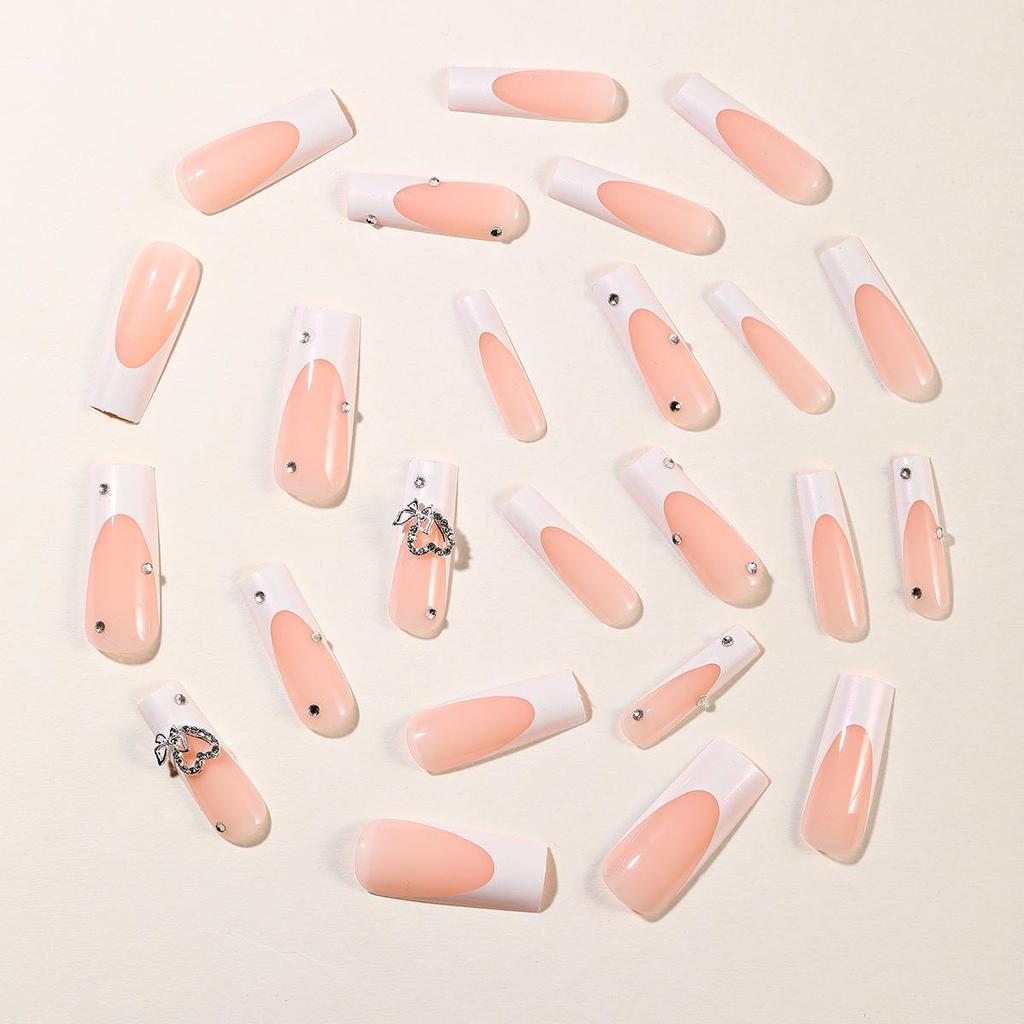 Long White Wearable Nails with Aurora French Tips, Heart & Butterfly Rhinestone Designs