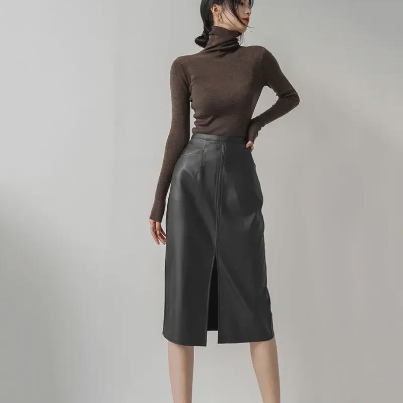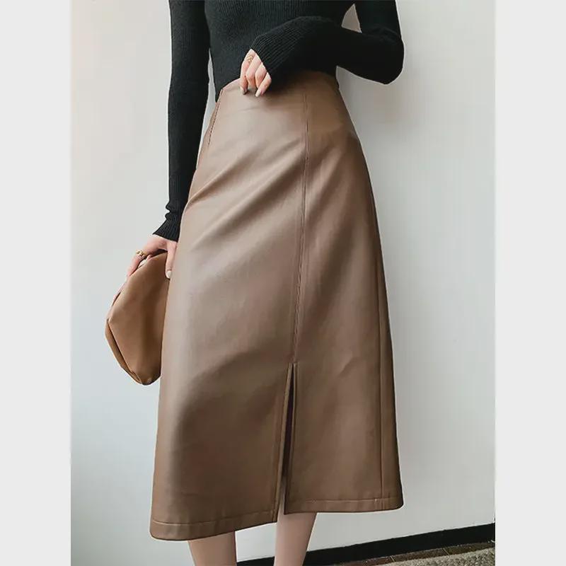 Юбка А-силуэта из искусственной кожи: Осень/Зима 2025, Приталенное Миди с Разрезом, Универсальный Корейский Стиль для Женщин