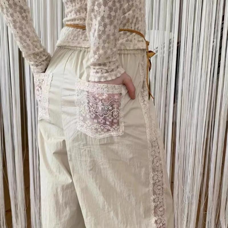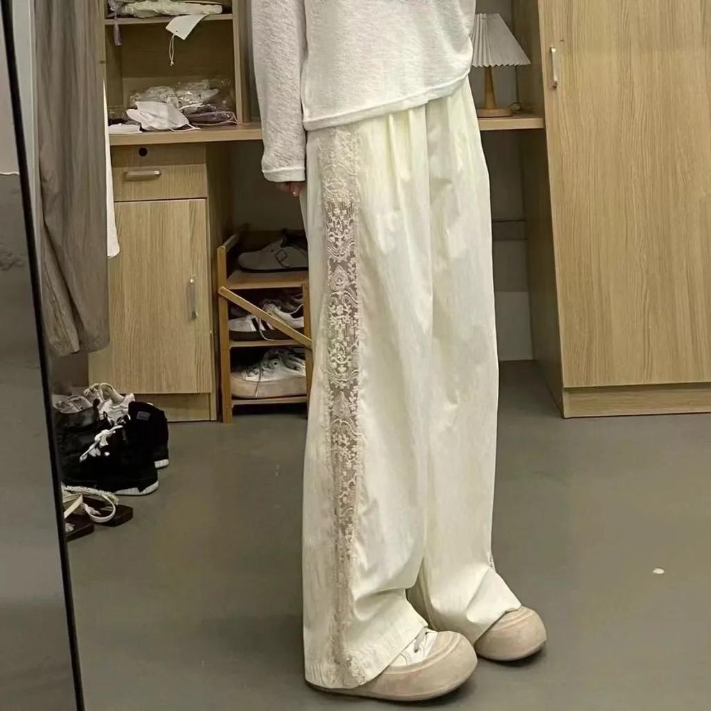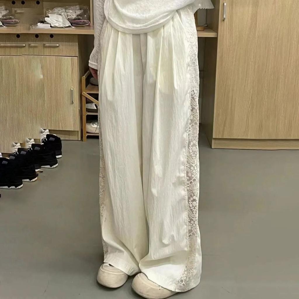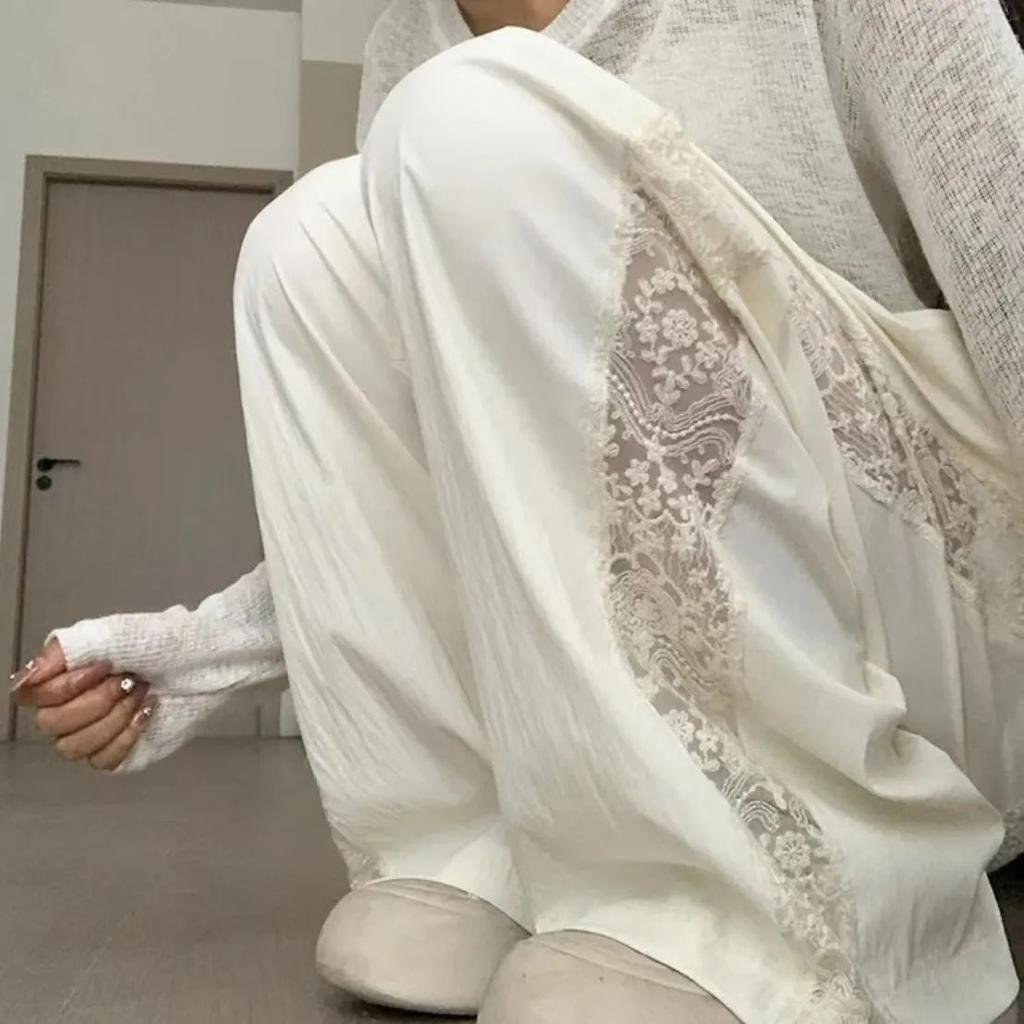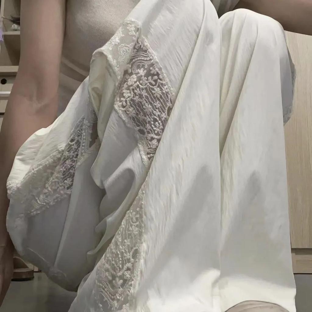 Женские летние стильные брюки с широкими штанинами и кружевной отделкой - Прямого кроя, повседневные, модные, длинные брюки