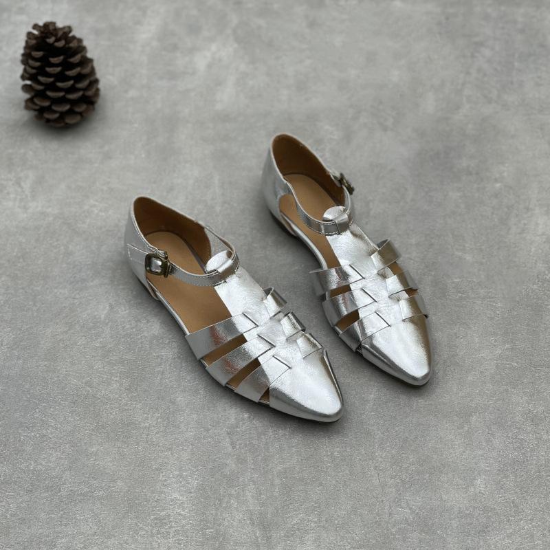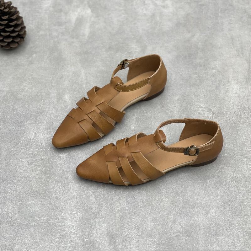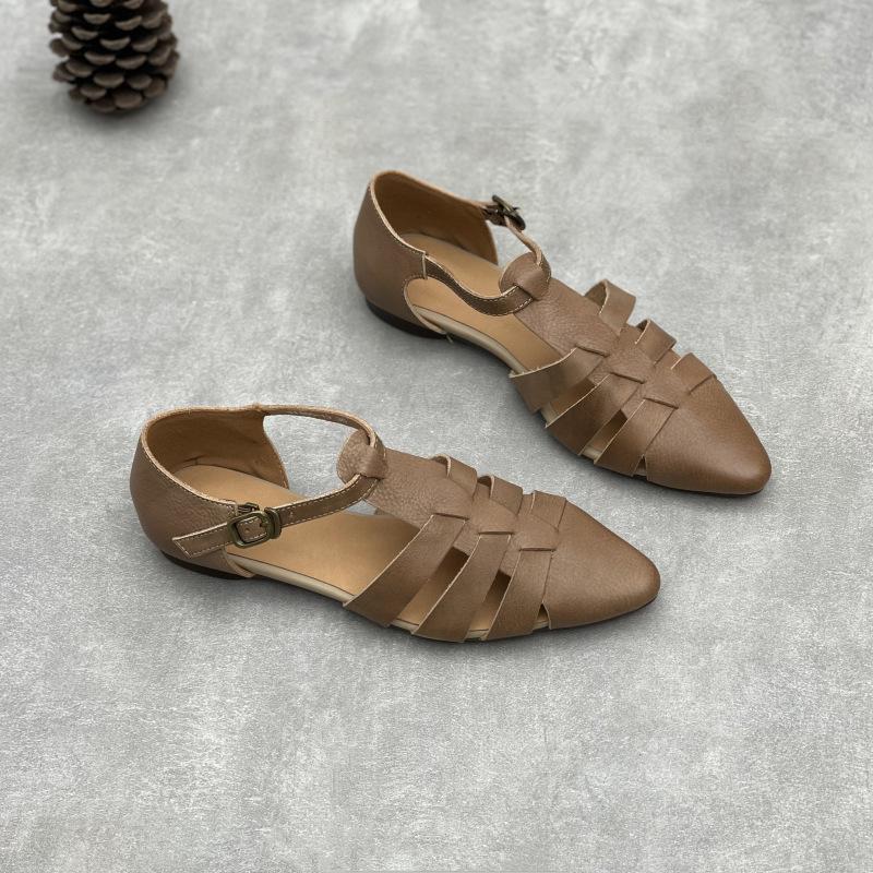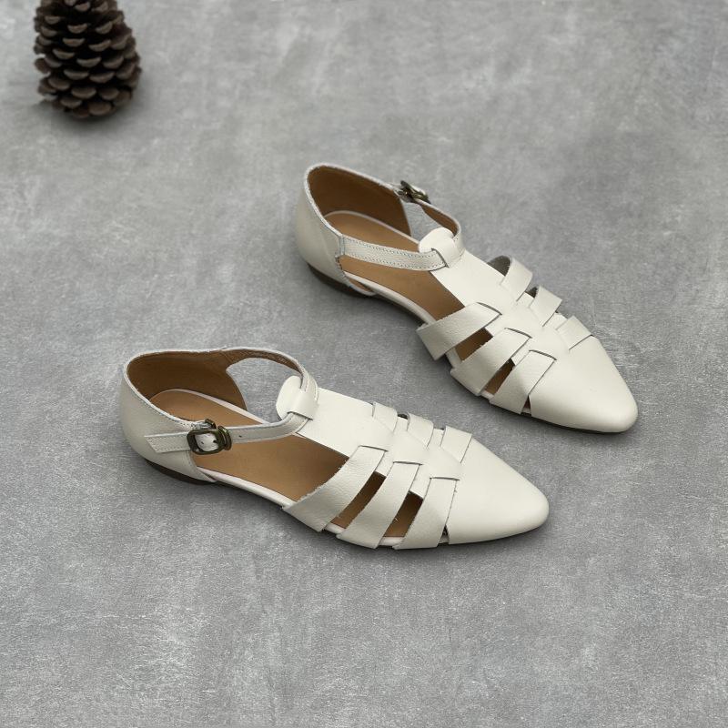 Johnature Ручная работа Сандалии из натуральной кожи с острым носком Ретро полые с пряжкой Плетеные туфли женские из коровьей кожи