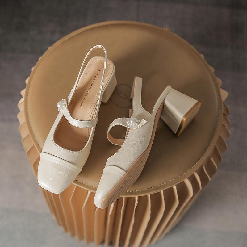 Жемчужные сандалии с квадратным носком, женская модная обувь на среднем толстом каблуке, туфли-лодочки на маленьком каблуке